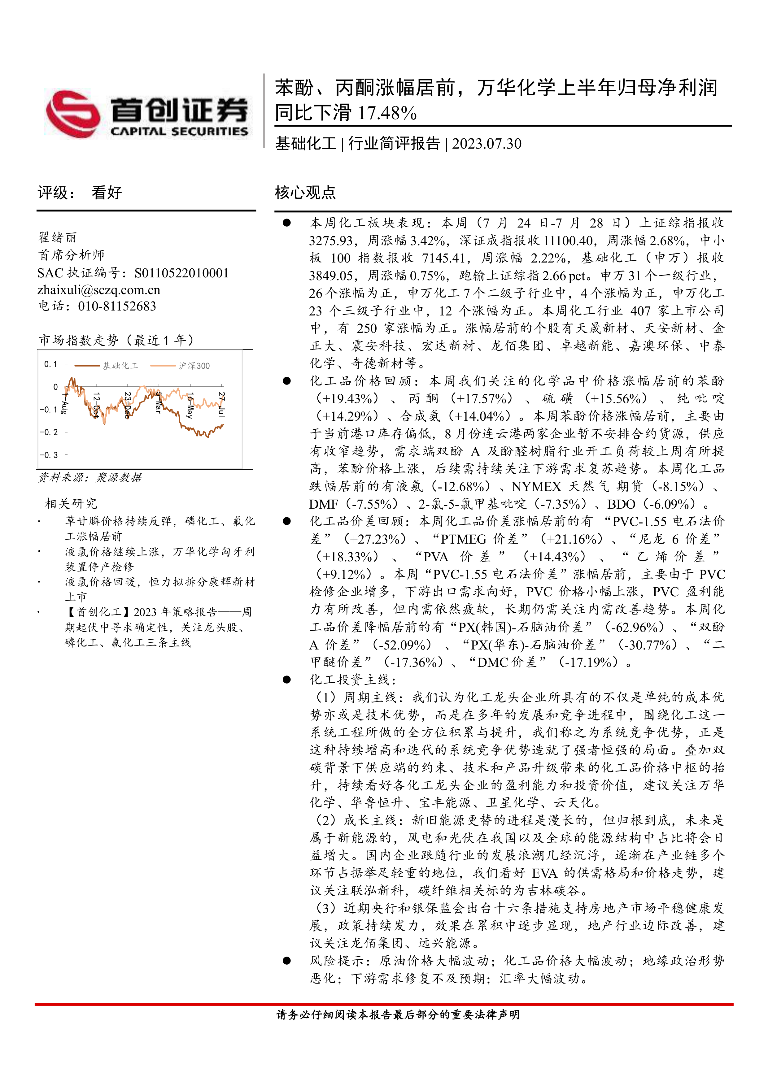 基础化工行业简评报告:苯酚、丙酮涨幅居前,万华化学上半年归母净利润同比下滑17.48%