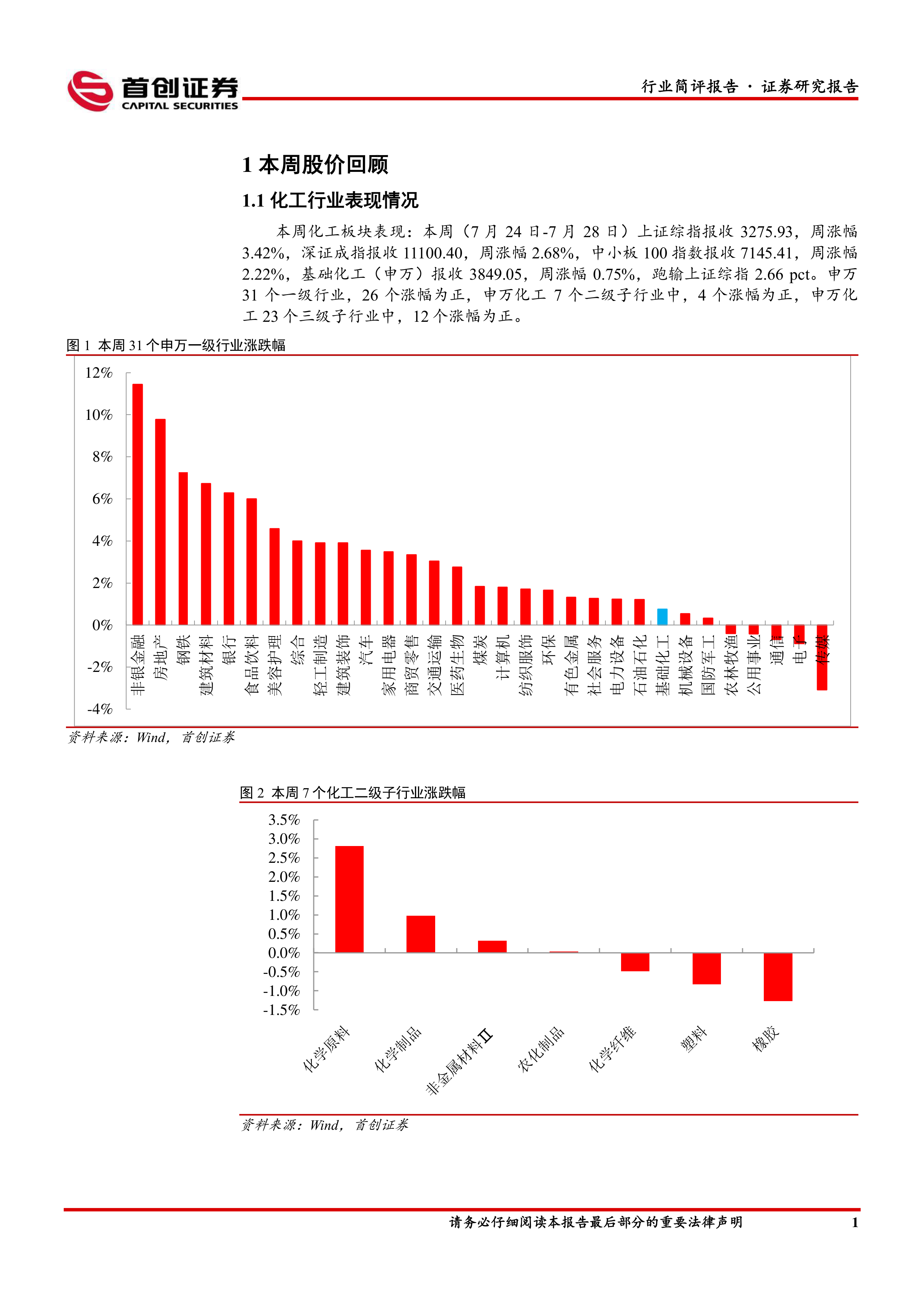本周(7月24日-7月28日),上证综指、深证成指、中小板100指数分别上涨3.42%、2.68%、2.22%。基础化工(申万)上涨0.75%,跑输上证综指2.66个百分点。申万31个一级行业中,26个涨幅为正;申万化工7个二级子行业中,4个涨幅为正;申万化工23个三级子行业中,12个涨幅为正。407家化工上市公司中,250家涨幅为正,个股表现分化明显。涨幅居前的个股主要集中在天晟新材、天安新材等公司,而跌幅居前的个股则包括建业股份、百合花等公司。