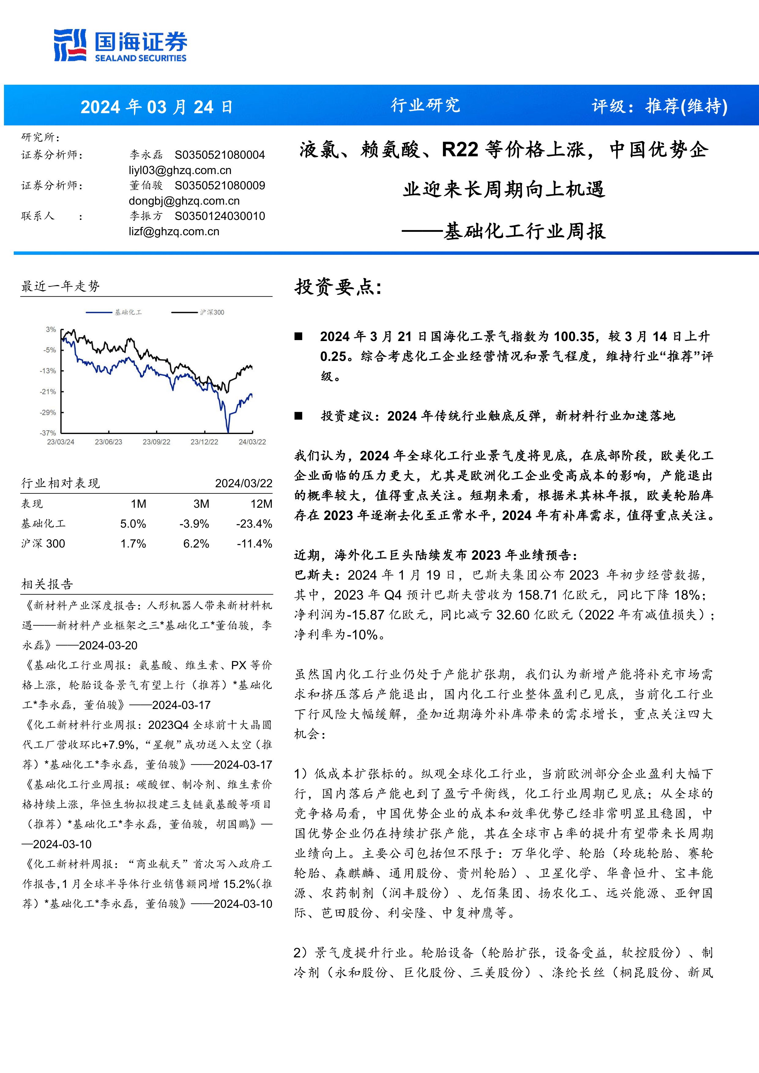 报告首先指出2024年3月21日国海化工景气指数为100.35,较前一周上升0.25,维持行业“推荐”评级。并提出2024年投资建议:关注传统行业触底反弹和新材料行业加速落地。 报告还分析了基础化工、沪深300指数最近一年及近期表现,以及海外化工巨头(巴斯夫等)的2023年业绩预告,佐证了全球化工行业景气度见底的判断。
