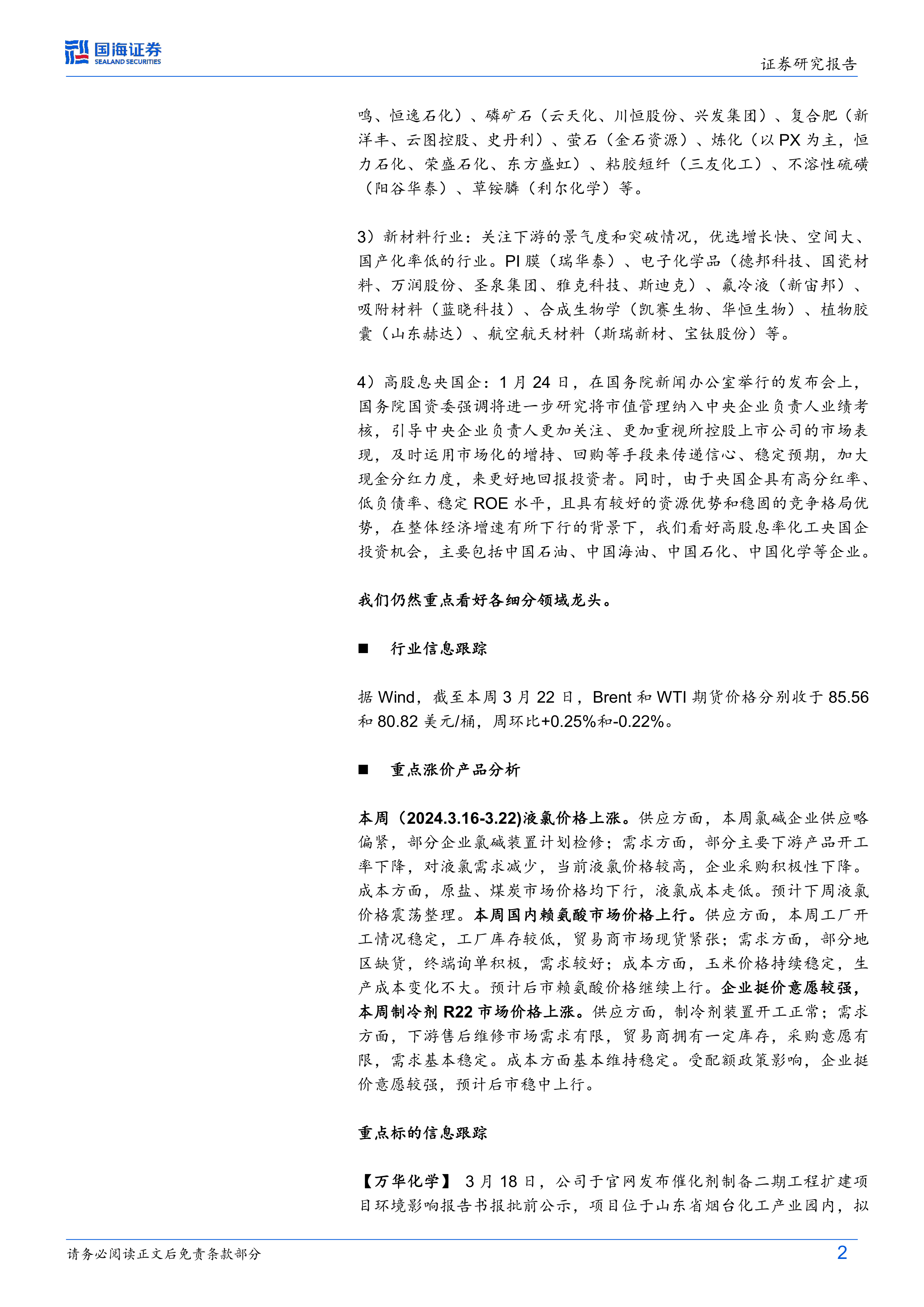 报告对万华化学、玲珑轮胎、赛轮轮胎、森麒麟、软控股份、中国石油、中国海油、中国石化、恒力石化、荣盛石化、桐昆股份、新凤鸣、远兴能源、华鲁恒升、宝丰能源、瑞华泰、中国化学、云图控股、卫星化学、扬农化工、国瓷材料、蓝晓科技、金石资源、三美股份、巨化股份、永和股份、利尔化学、广信股份、长青股份、山东海化、海利尔、江化微、华恒生物、金发科技、山东赫达、道恩股份、利安隆、恒逸石化、东方盛虹、阳谷华泰、双箭股份、华峰化学、粤桂股份、中化国际、新亚强、凯盛新材、万润股份、楚江新材、新和成、龙佰集团、金禾实业、赞宇科技、雅克科技、三棵树、中毅达、三友化工、新洋丰、齐翔腾达等重点公司进行了信息跟踪,包括公司公告、产品价格、库存等数据,并结合公司基本面和行业发展趋势进行分析。 报告还提供了重点关注公司的股票代码、2024年3月22日股价、2022年、2023年预期及2024年预期每股收益(EPS)和市盈率(PE)等数据。