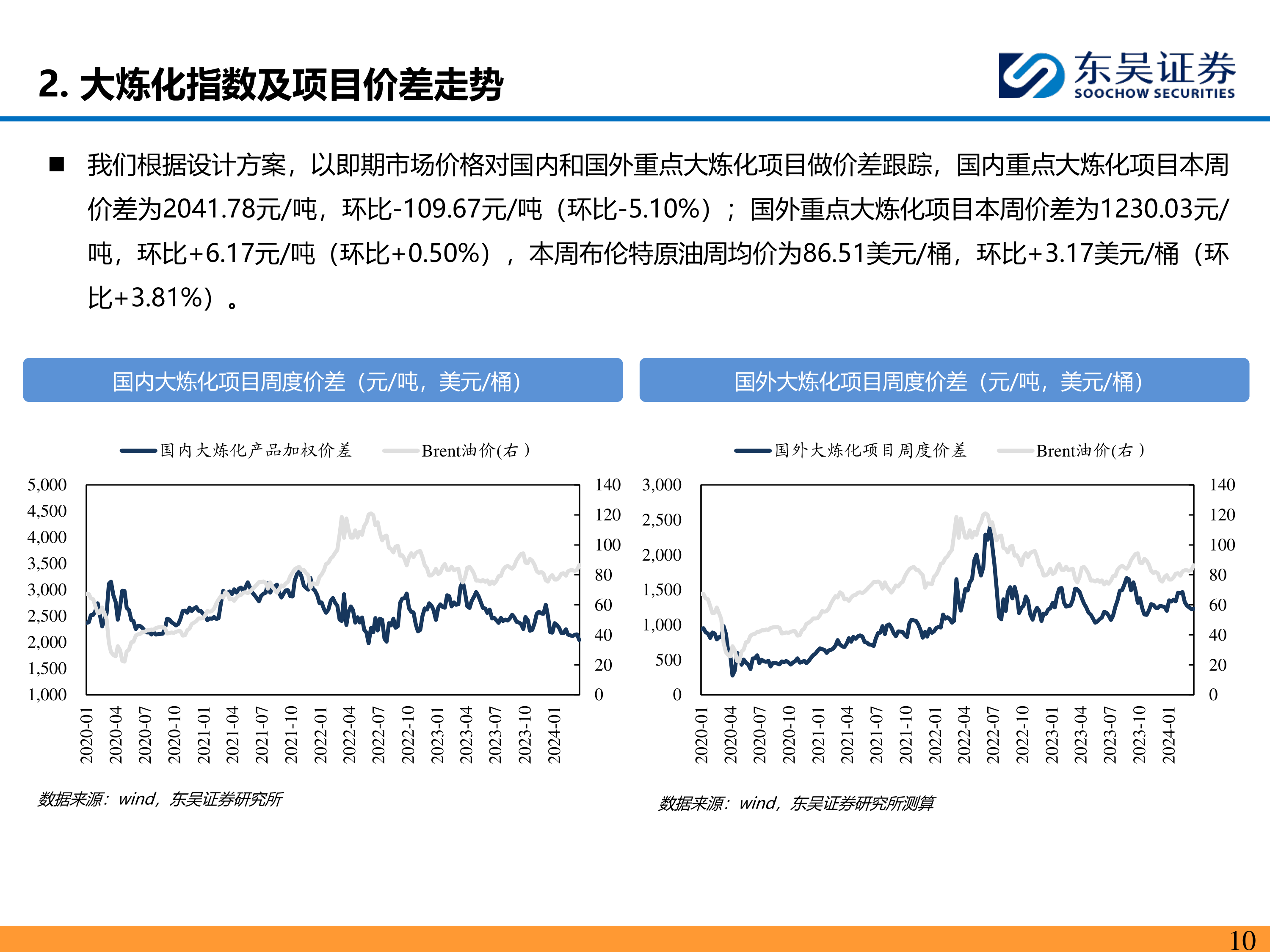 报告对国内外重点大炼化项目的价差进行了跟踪,数据显示,本周国内重点大炼化项目价差为2041.78元/吨,环比下降5.10%;国外重点大炼化项目价差为1230.03元/吨,环比上涨0.50%。同时,报告还跟踪了布伦特原油价格的变动,本周布伦特原油周均价为86.51美元/桶,环比上涨3.81%。 这表明国内外炼化行业盈利能力存在差异,且国内市场受多种因素影响波动较大。