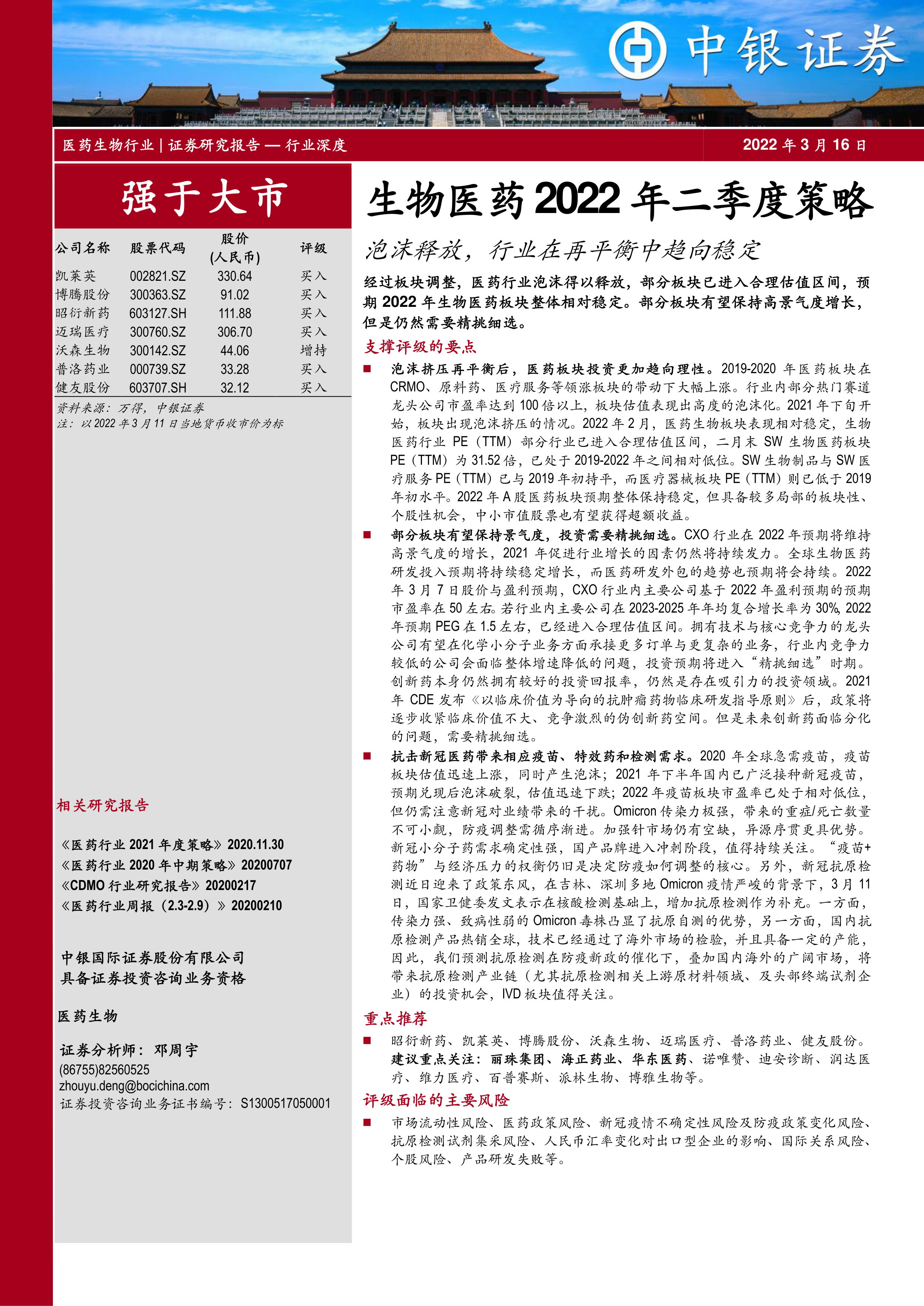 生物医药2022年二季度策略:泡沫释放,行业在再平衡中趋向稳定