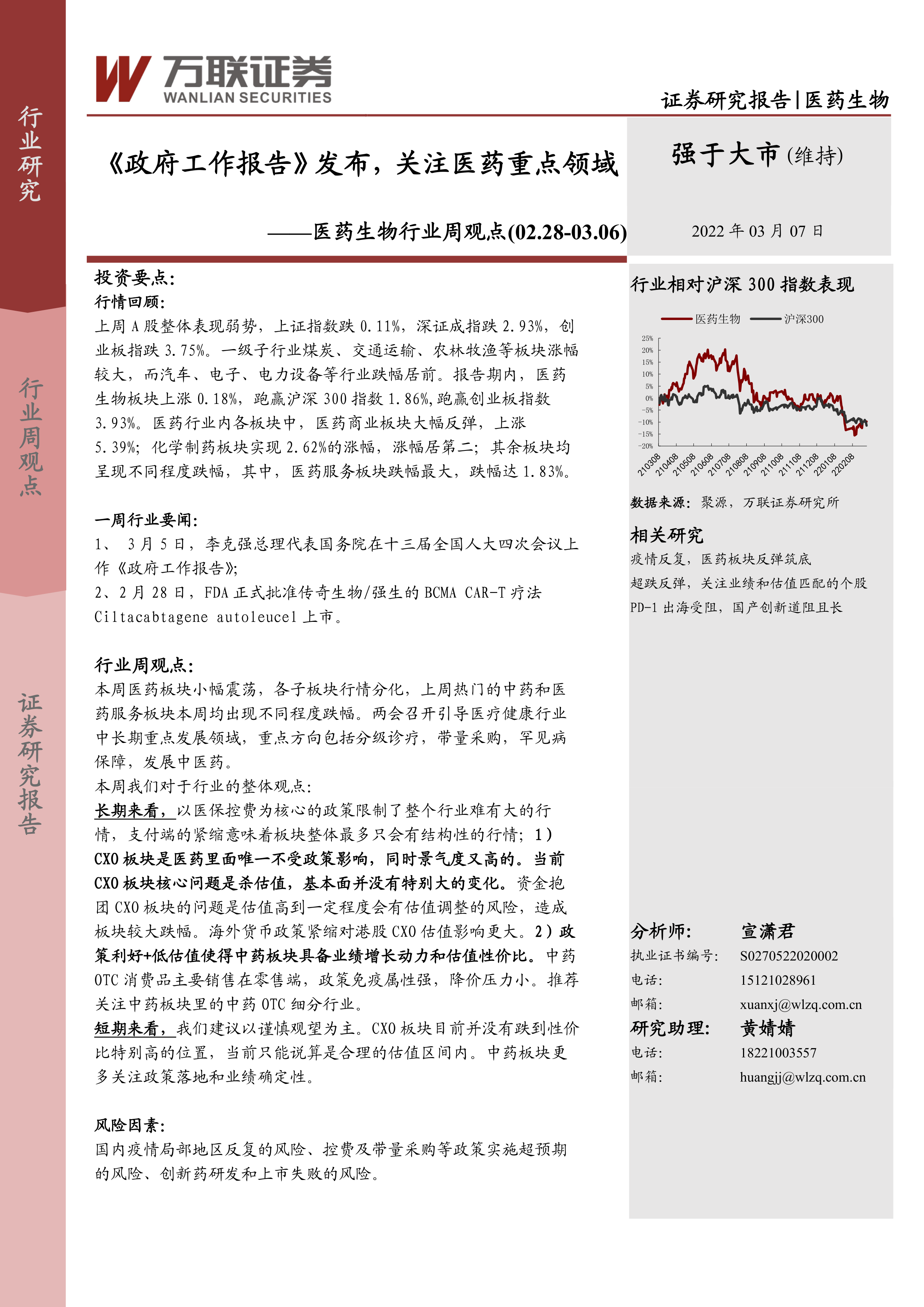 本报告对上周医药市场行情、重要行业事件以及国内疫情情况进行了分析,并对CXO板块和中药板块的投资价值进行了深入探讨。报告认为,短期内医药板块将持续震荡分化,长期来看,医保控费政策将持续影响行业发展,结构性行情将成为主要特征。投资者应密切关注政策变化和公司业绩,谨慎投资,选择具有长期竞争力和发展潜力的细分领域。 报告最后也提示了国内疫情反复、控费政策超预期以及创新药研发失败等风险因素。