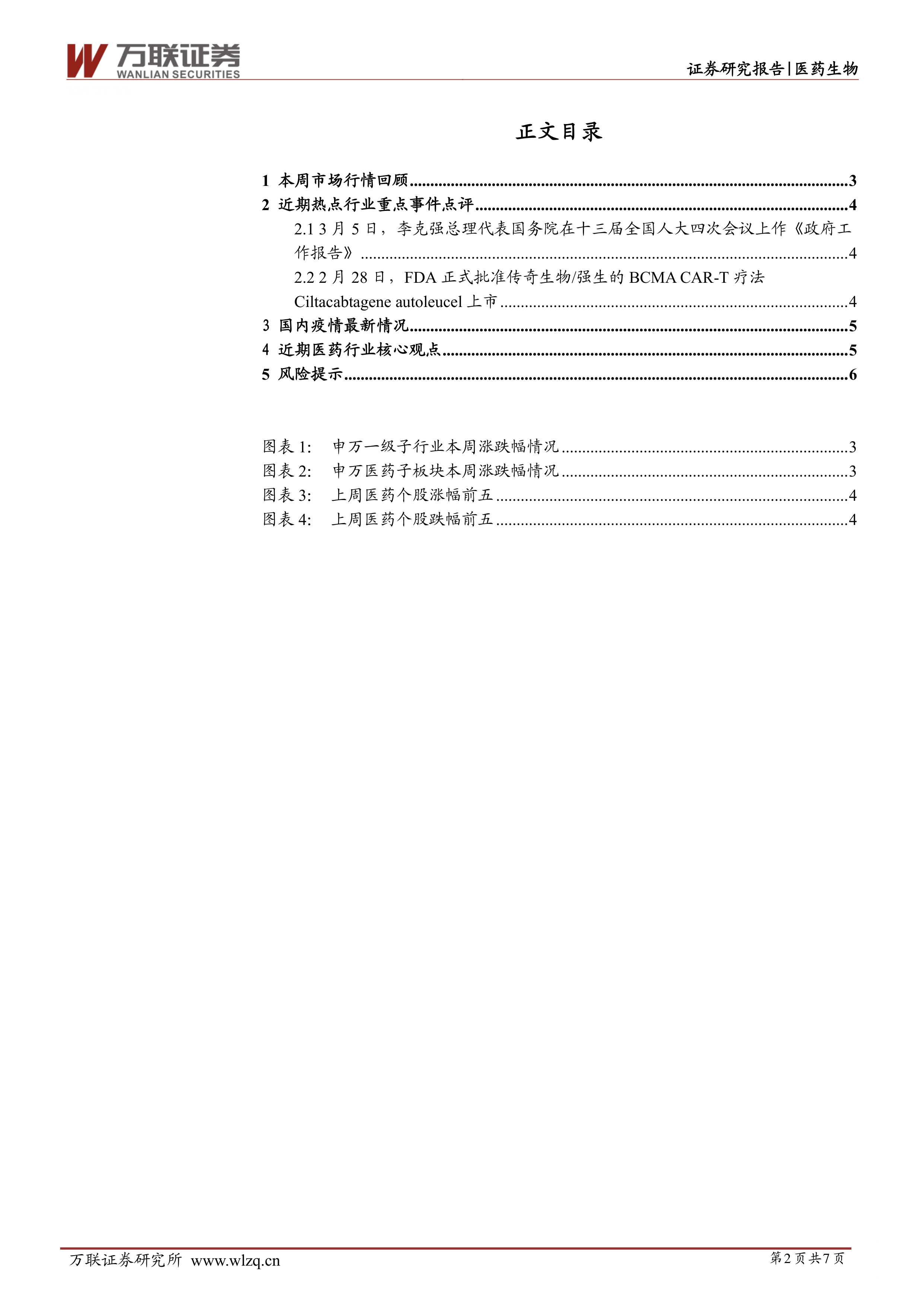 本周医药板块小幅震荡,各子板块行情分化,上周热门的中药和医药服务板块本周均出现不同程度跌幅。两会召开引导医疗健康行业中长期重点发展领域,重点方向包括分级诊疗,带量采购,罕见病保障,发展中医药。