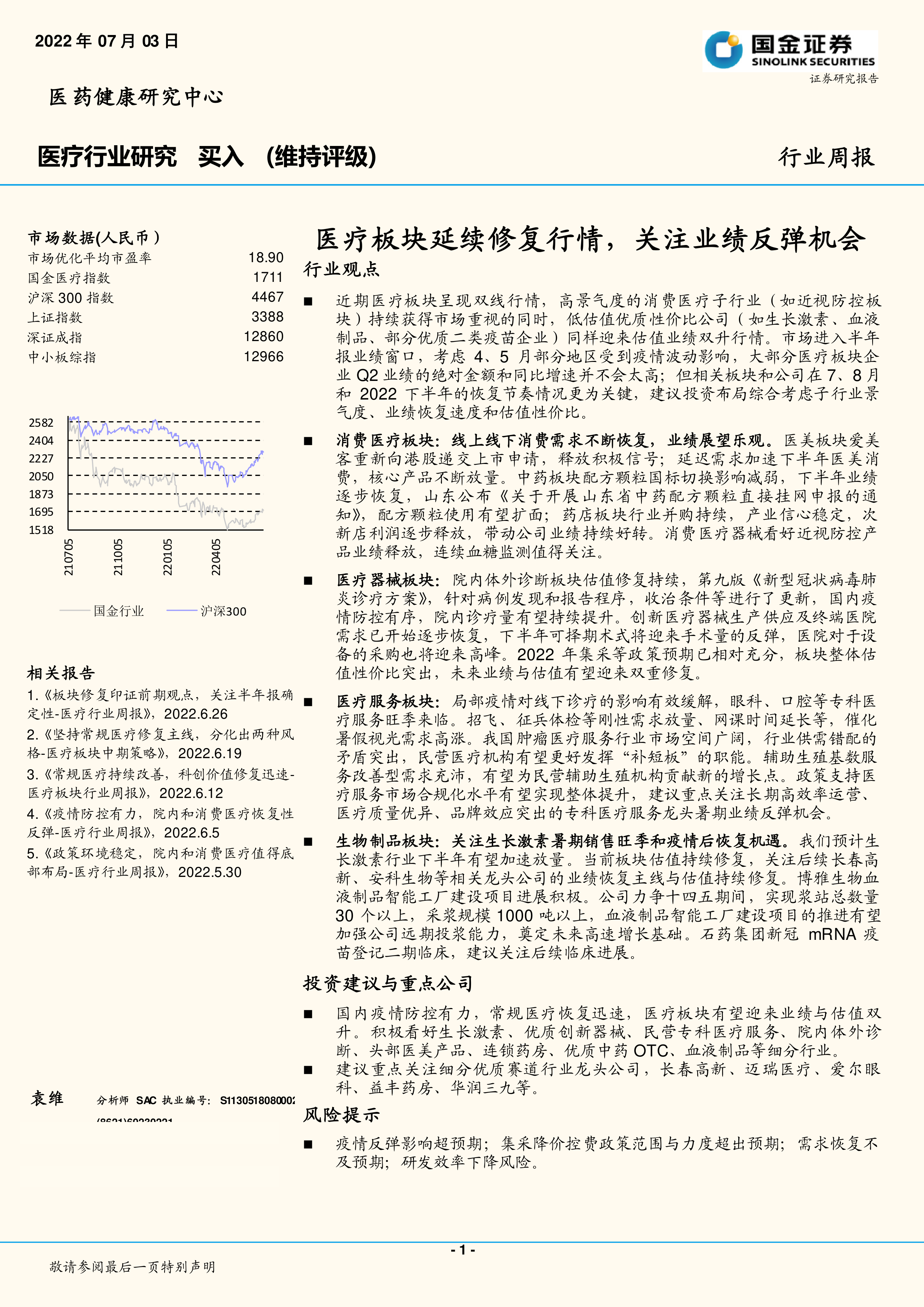 生物制品板块:关注生长激素暑期销售旺季和疫情后恢复机遇。我们预计生长激素行业下半年有望加速放量。当前板块估值持续修复,关注后续长春高新、安科生物等相关龙头公司的业绩恢复主线与估值持续修复。博雅生物血液制品智能工厂建设项目进展积极。公司力争十四五期间,实现浆站总数量30个以上,采浆规模1000吨以上,血液制品智能工厂建设项目的推进有望加强公司远期投浆能力,奠定未来高速增长基础。石药集团新冠mRNA疫苗登记二期临床,建议关注后续临床进展。