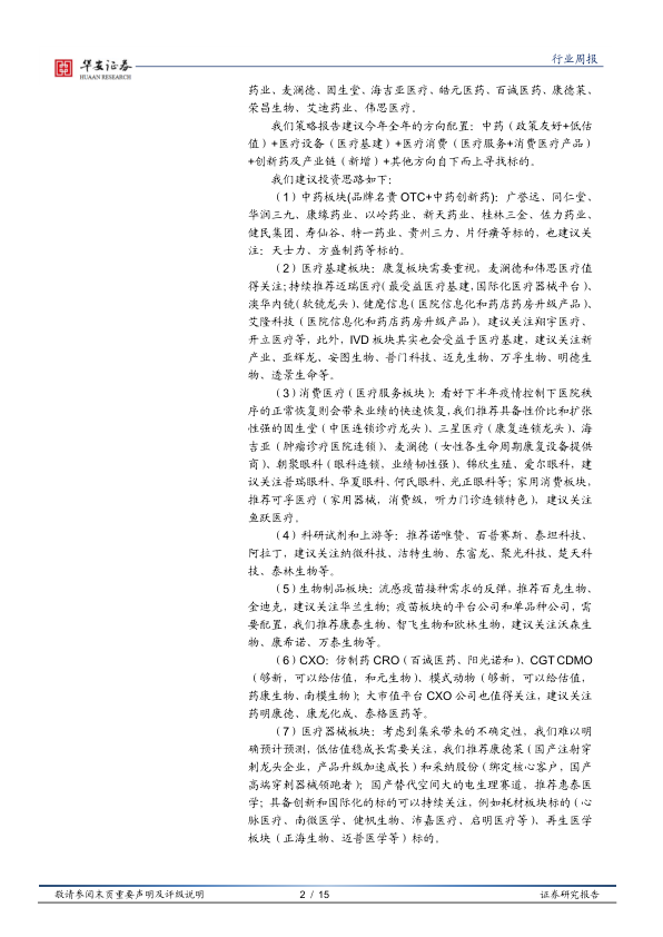 报告还提出了全年的方向配置建议:中药(政策友好+低估值)、医疗设备(医疗基建)、医疗消费(医疗服务+消费医疗产品)、创新药及产业链(新增)以及其他方向的自下而上寻找标的。 并对各个细分领域推荐了具体的投资标的,涵盖中药、医疗基建、消费医疗、科研试剂、生物制品、CXO、医疗器械和创新药等多个方面。