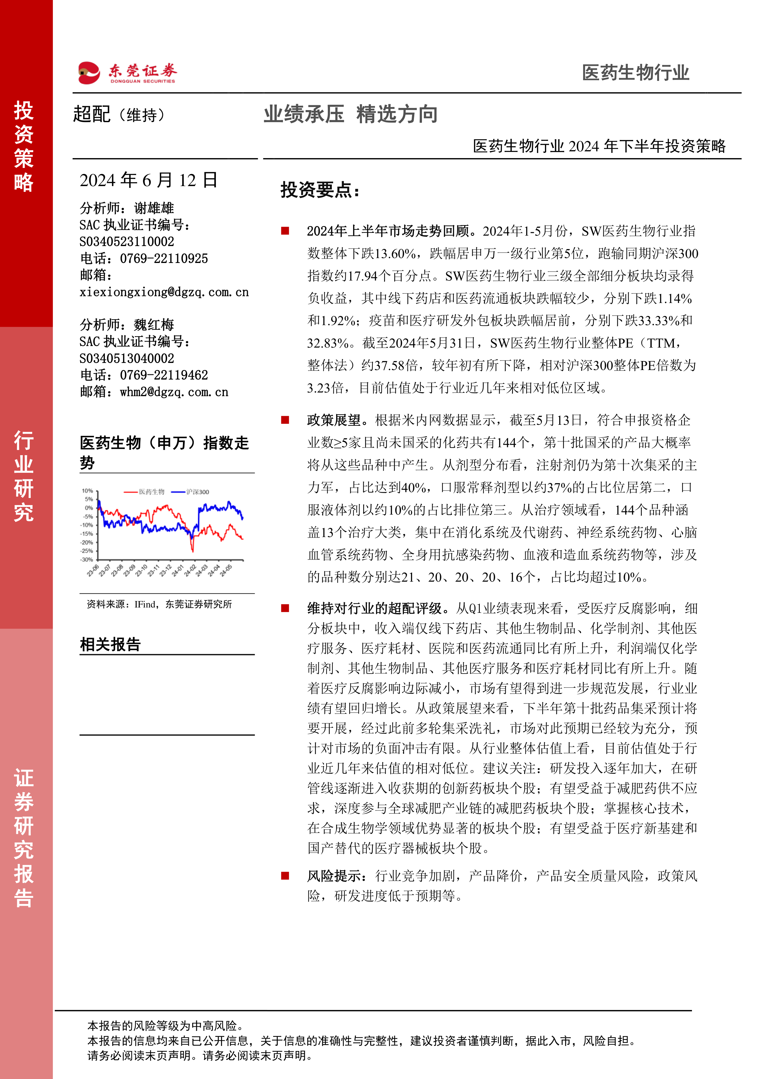 本报告对2024年下半年医药生物行业投资策略进行分析,核心观点如下: