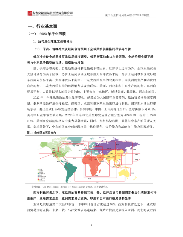 油气及全球化工供需格局: 俄乌冲突导致全球原油贸易格局深度调整,俄罗斯原油出口东移,美国和中东竞争俄罗斯空缺市场。北溪事件冲击欧洲管道气供应,导致欧洲化工产业遭受原材料供应及价格双重冲击,部分化工品全球供应格局重构。亚洲,特别是印度和中国的原油需求增长较快,成为俄罗斯原油的主要出口市场。
