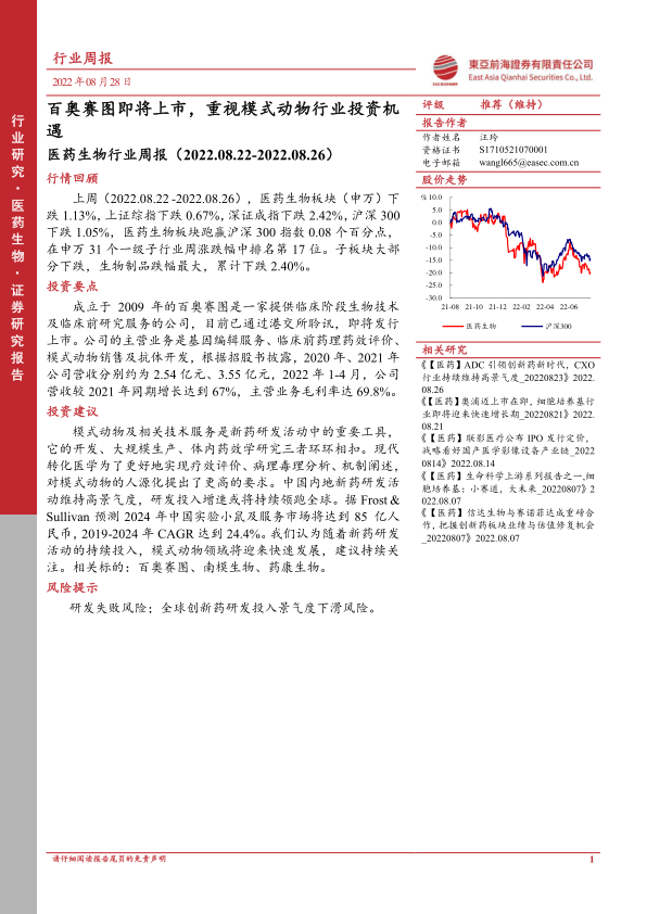 医药生物行业周报:百奥赛图即将上市,重视模式动物行业投资机遇