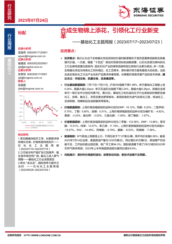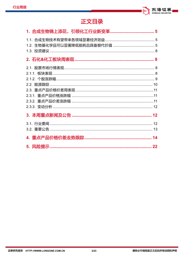 本报告涵盖了合成生物技术在化工行业的应用前景、石化与化工板块的周度市场表现、重点产品价格及价差的波动分析,以及行业新闻和公告等方面的内容。