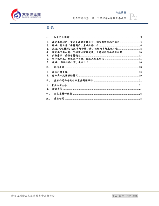 纯碱市场重碱价格上升,主要受益于玻璃行业出货乐观,但轻碱市场行情偏弱。光伏/风电材料方面,EVA市场价格下降,碳纤维市场表现不佳,下游压价情绪明显。锂电化工新材料方面,下游需求回暖缓慢,六氟磷酸锂、电解液、正极材料、负极材料、前驱体价格均有所下滑。PVC价格上涨,毛利上升,但库存量仍然较高。