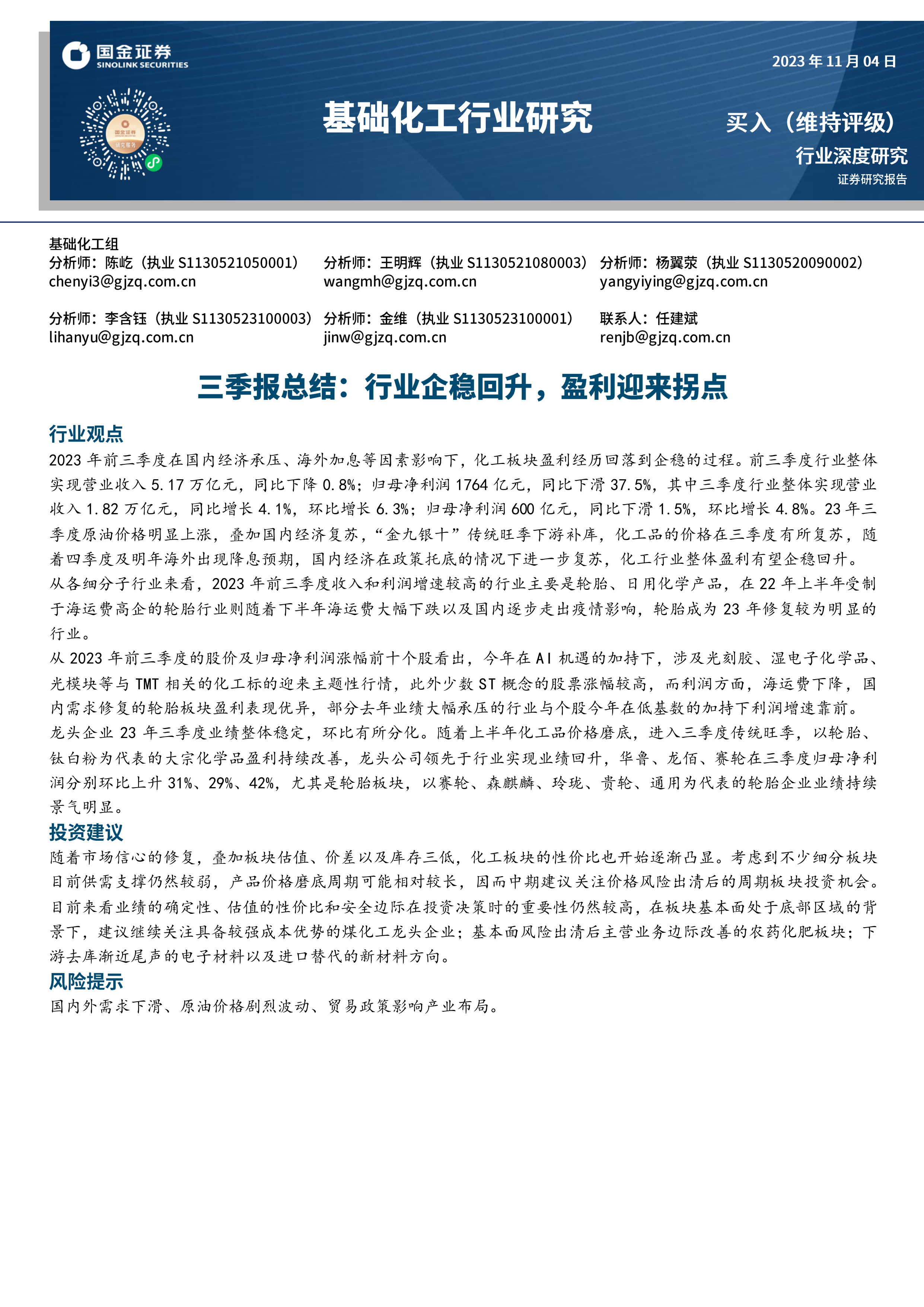 基础化工行业研究:三季报总结:行业企稳回升,盈利迎来拐点