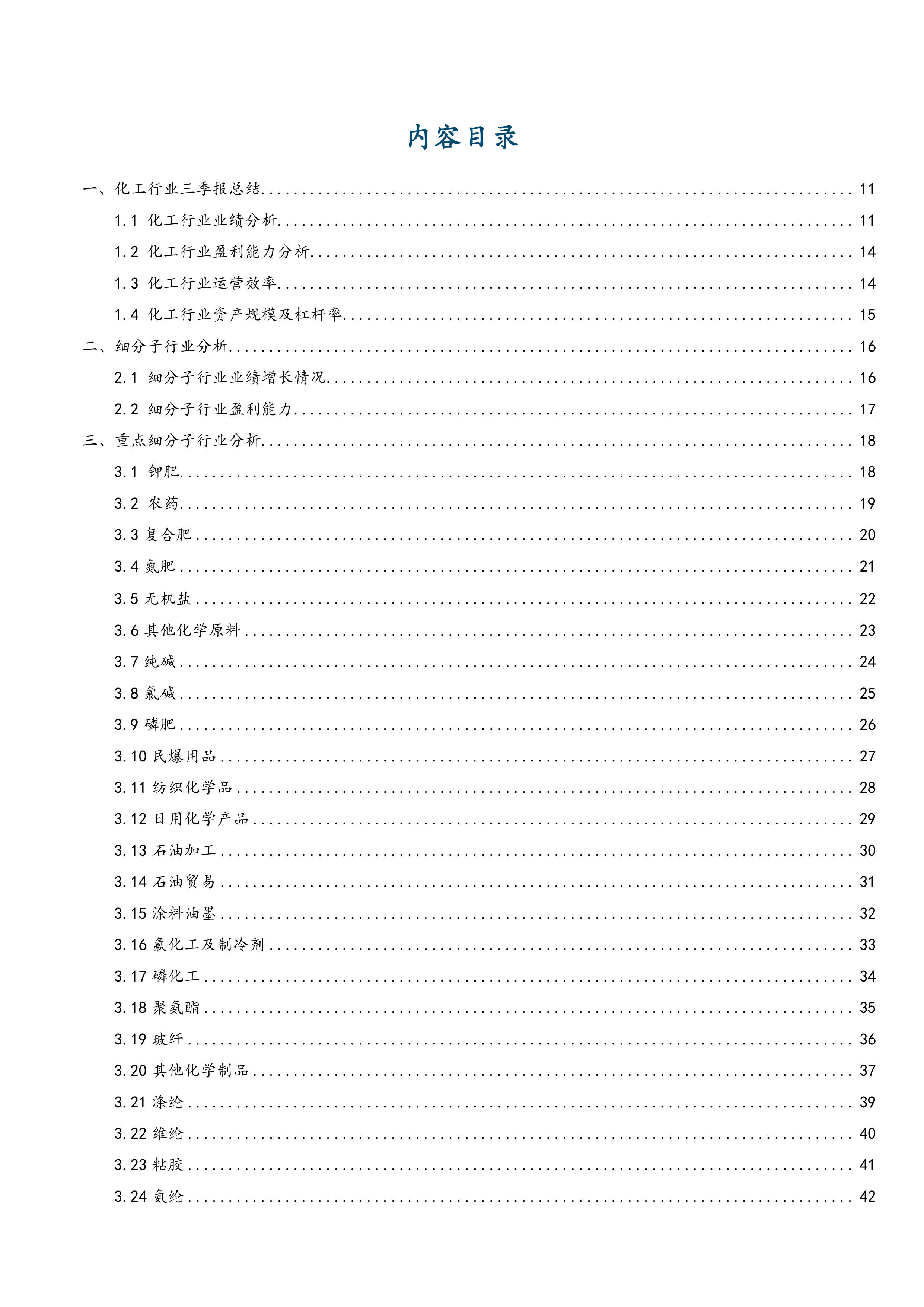 本报告按照目录结构,对化工行业2023年前三季度数据进行了详细分析,主要内容包括: