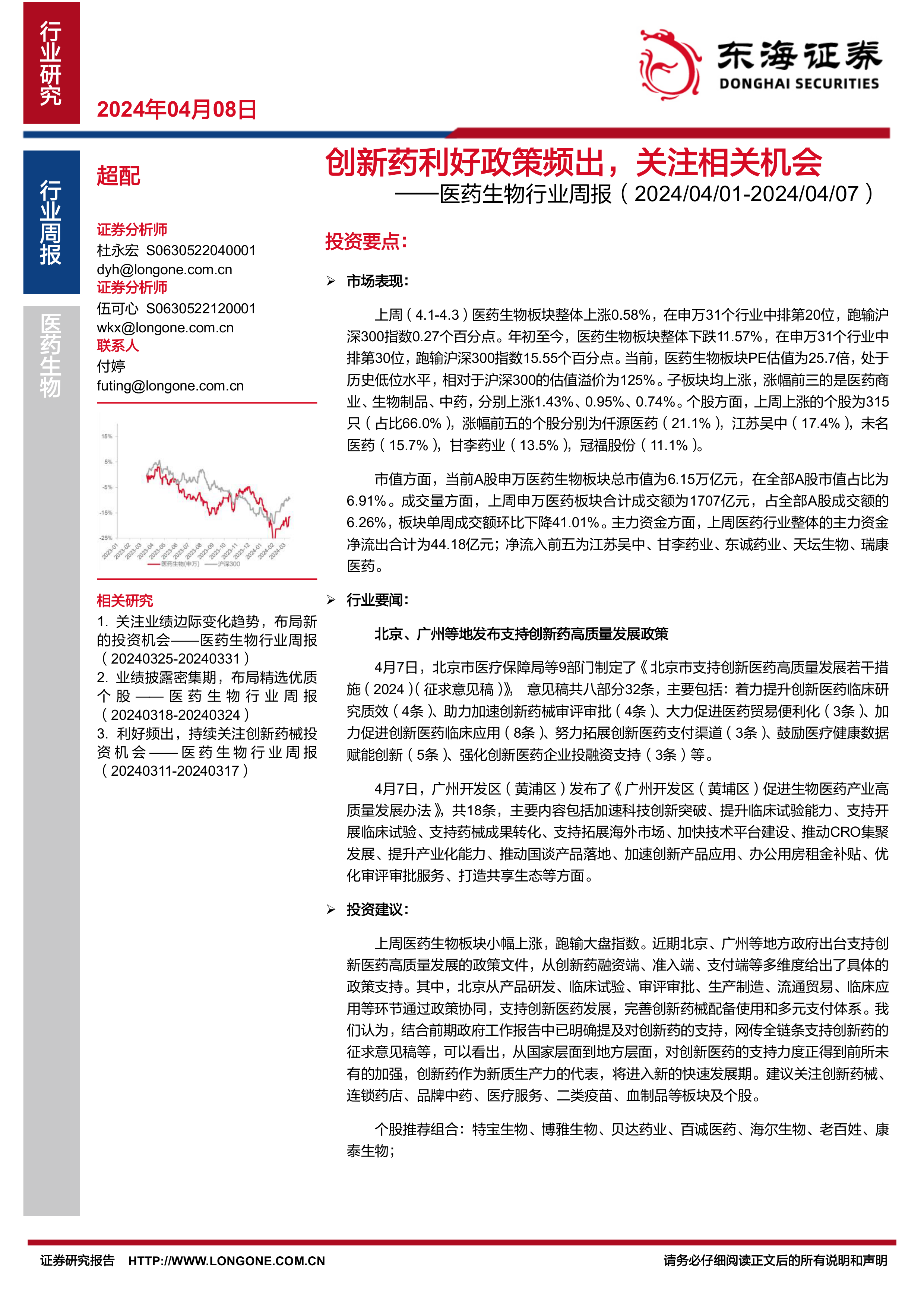 本报告对2024年4月1日至4月3日医药生物板块的市场表现进行了全面分析,并重点关注了创新药领域。北京和广州等地出台的政策为创新药发展提供了强有力的支持,预示着创新药将迎来快速发展期。报告建议投资者关注相关板块和个股,同时需注意潜在的政策、业绩和突发事件风险。 报告数据主要来源于Wind数据库,并结合了公开信息和研究人员的分析判断。 投资者应根据自身风险承受能力和投资目标,谨慎决策。