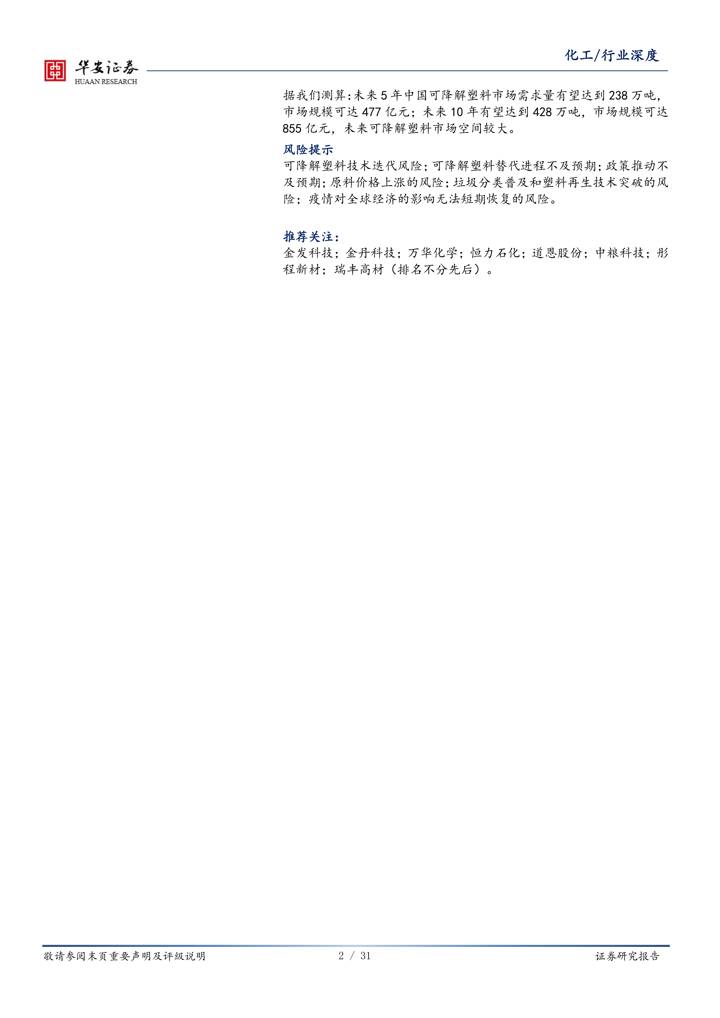 报告最后列出了可降解塑料行业面临的风险,包括技术迭代风险、替代进程不及预期、政策推动不及预期、原料价格上涨风险、垃圾分类普及和塑料再生技术突破风险以及疫情对全球经济的影响等。