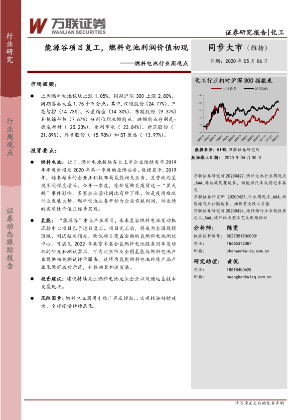 本报告分析了2020年5月第一周燃料电池行业的市场表现、行业热点事件以及相关公司动态。尽管一季度受疫情影响,燃料电池行业营收有所下降,但燃料电池业务已开始为企业贡献利润,且国家政策和重大项目的推进为行业发展提供了强劲动力。“能源谷”项目的复工以及其他氢能项目的进展,都预示着燃料电池行业未来发展潜力巨大。报告建议投资者持续关注燃料电池龙头企业以及储运氢技术的发展,但同时也需注意潜在的风险因素,例如商用车推广不及预期、宏观经济下行以及疫情持续的影响。 报告数据主要来源于Wind和iFinD等公开信息,其准确性和完整性未经验证。