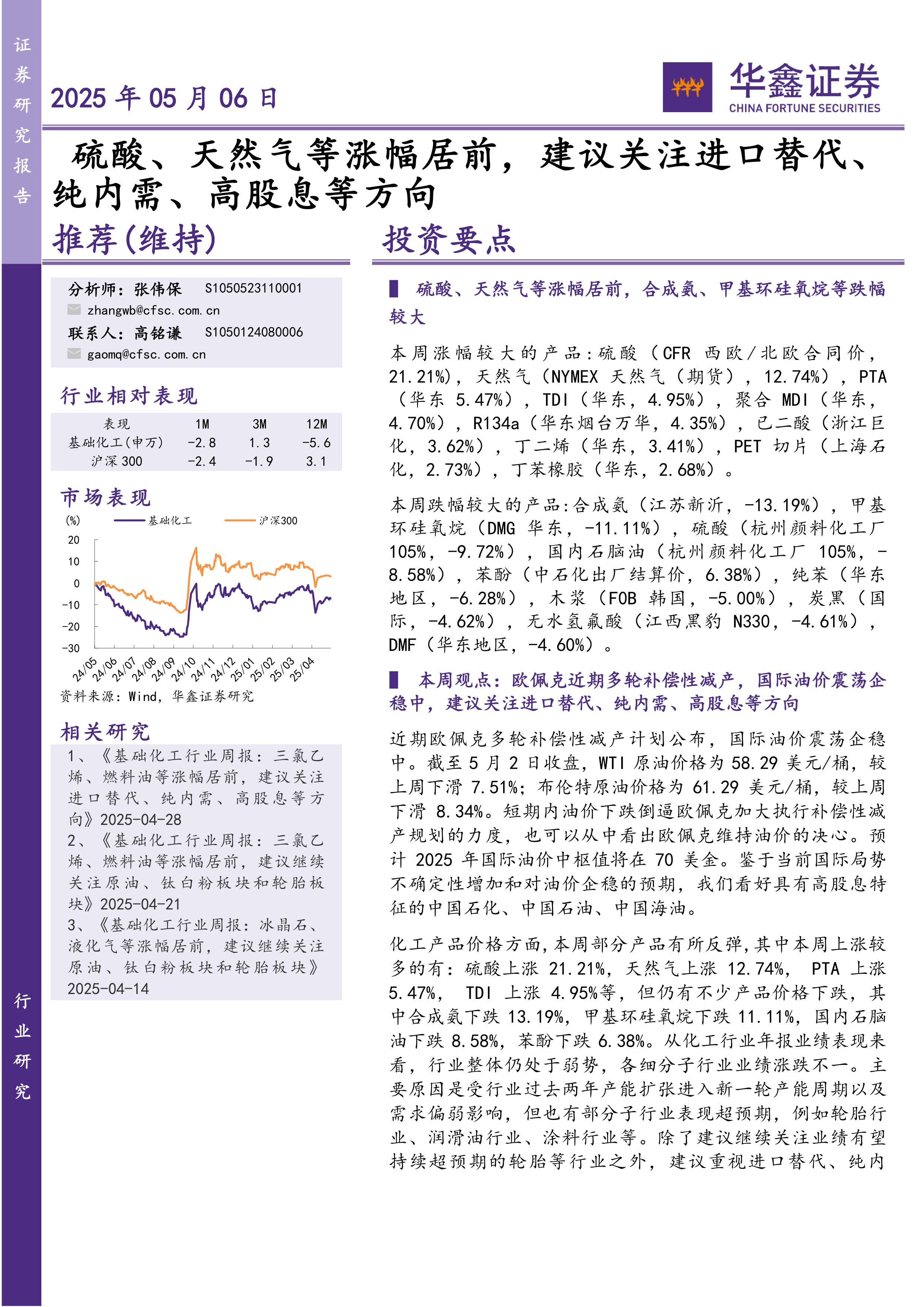 本报告基于对近期国际油价、中美关税政策以及化工行业市场表现的分析,建议投资者关注进口替代、纯内需和高股息三个投资方向。报告详细分析了各个细分市场的动态,并推荐了相应的重点关注公司,为投资者提供了有价值的投资参考。 然而,投资者需注意报告中提到的风险提示,并根据自身情况进行独立判断。