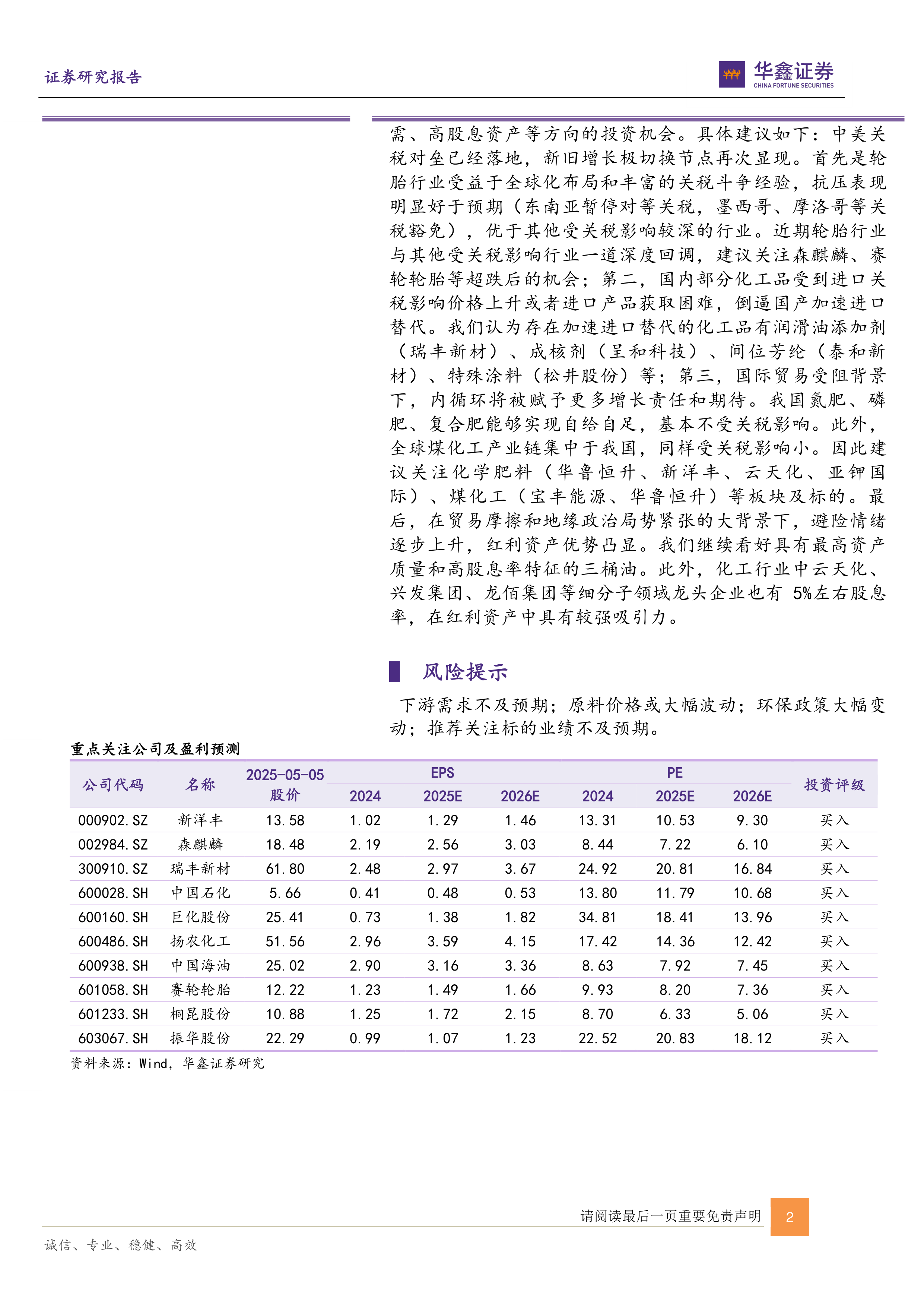 化工产品价格方面,本周部分产品有所反弹,其中本周上涨较多的有:硫酸上涨21.21%,天然气上涨12.74%,PTA上涨5.47%,TDI上涨4.95%等,但仍有不少产品价格下跌,其中合成氨下跌13.19%,甲基环硅氧烷下跌11.11%,国内石脑油下跌8.58%,苯酚下跌6.38%。从化工行业年报业绩表现来看,行业整体仍处于弱势,各细分子行业业绩涨跌不一。主要原因是受行业过去两年产能扩张进入新一轮产能周期以及需求偏弱影响,但也有部分子行业表现超预期,例如轮胎行业、润滑油行业、涂料行业等。除了建议继续关注业绩有望持续超预期的轮胎等行业之外,建议重视进口替代、纯内需、高股息资产等方向的投资机会。具体建议如下:中美关税对垒已经落地,新旧增长极切换节点再次显现。首先是轮胎行业受益于全球化布局和丰富的关税斗争经验,抗压表现明显好于预期(东南亚暂停对等关税,墨西哥、摩洛哥等关税豁免),优于其他受关税影响较深的行业。近期轮胎行业与其他受关税影响行业一道深度回调,建议关注森麒麟、赛轮轮胎等超跌后的机会;第二,国内部分化工品受到进口关税影响价格上升或者进口产品获取困难,倒逼国产加速进口替代。我们认为存在加速进口替代的化工品有润滑油添加剂(瑞丰新材)、成核剂(呈和科技)、间位芳纶(泰和新材)、特殊涂料(松井股份)等;第三,国际贸易受阻背景下,内循环将被赋予更多增长责任和期待。我国氮肥、磷肥、复合肥能够实现自给自足,基本不受关税影响。此外,全球煤化工产业链集中于我国,同样受关税影响小。因此建议关注化学肥料(华鲁恒升、新洋丰、云天化、亚钾国际)、煤化工(宝丰能源、华鲁恒升)等板块及标的。最后,在贸易摩擦和地缘政治局势紧张的大背景下,避险情绪逐步上升,红利资产优势凸显。我们继续看好具有最高资产质量和高股息率特征的三桶油。此外,化工行业中云天化、兴发集团、龙佰集团等细分子领域龙头企业也有5%左右股息率,在红利资产中具有较强吸引力。