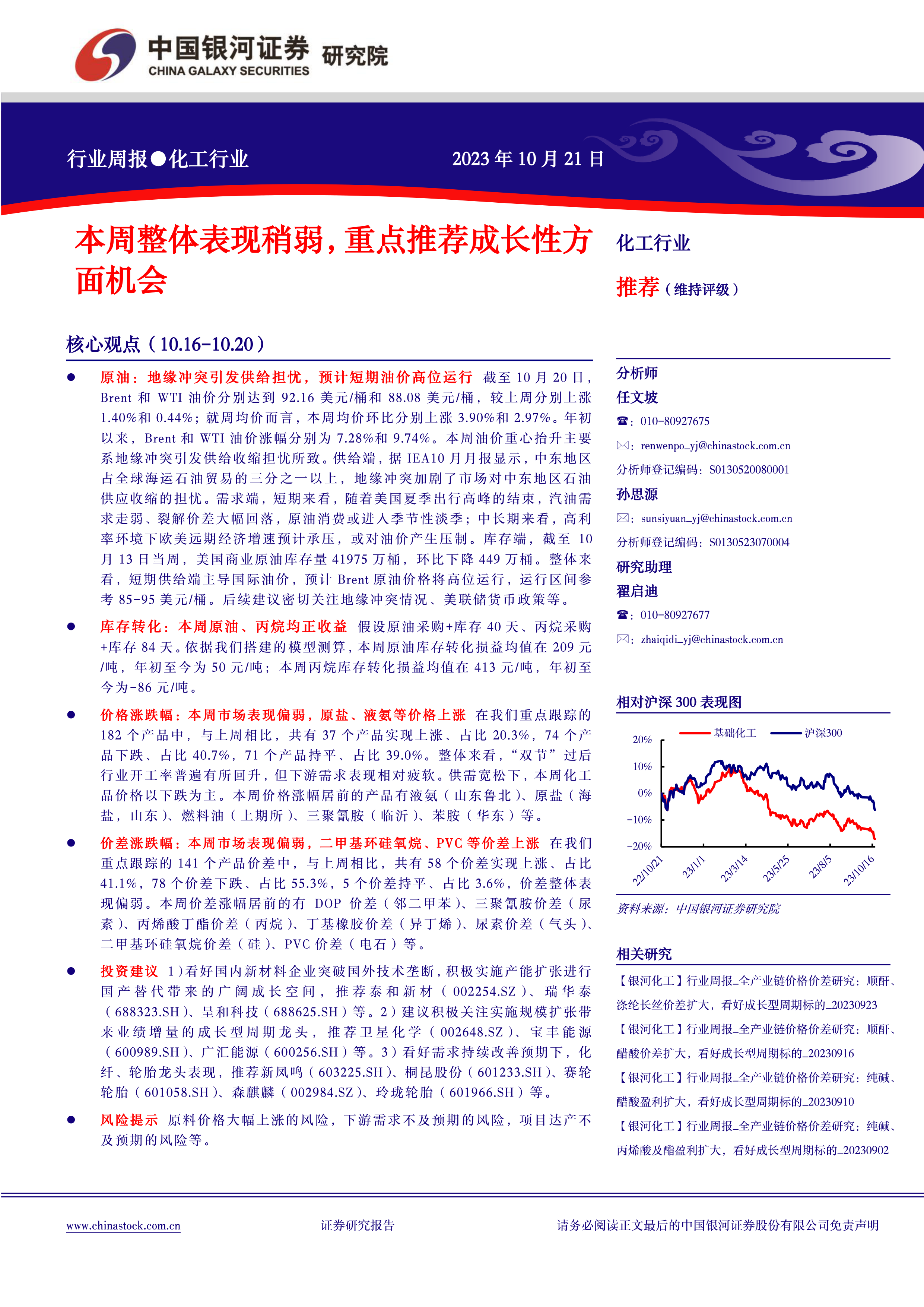 本报告对化工行业本周市场表现进行了全面分析,指出本周化工行业整体表现偏弱,但部分产品价格上涨,主要受地缘政治冲突导致的原油供给担忧以及部分产品供给收缩影响。 通过对价格、价差以及库存转化的分析,报告揭示了化工品市场供需错配的现状,并据此提出了相应的投资建议,重点推荐了在新材料、周期龙头和化纤轮胎等领域具有发展潜力的企业。 报告数据详实,分析深入,为投资者提供了有价值的参考信息。 然而,报告也提示了原料价格大幅上涨、下游需求不及预期以及项目达产不及预期等风险。