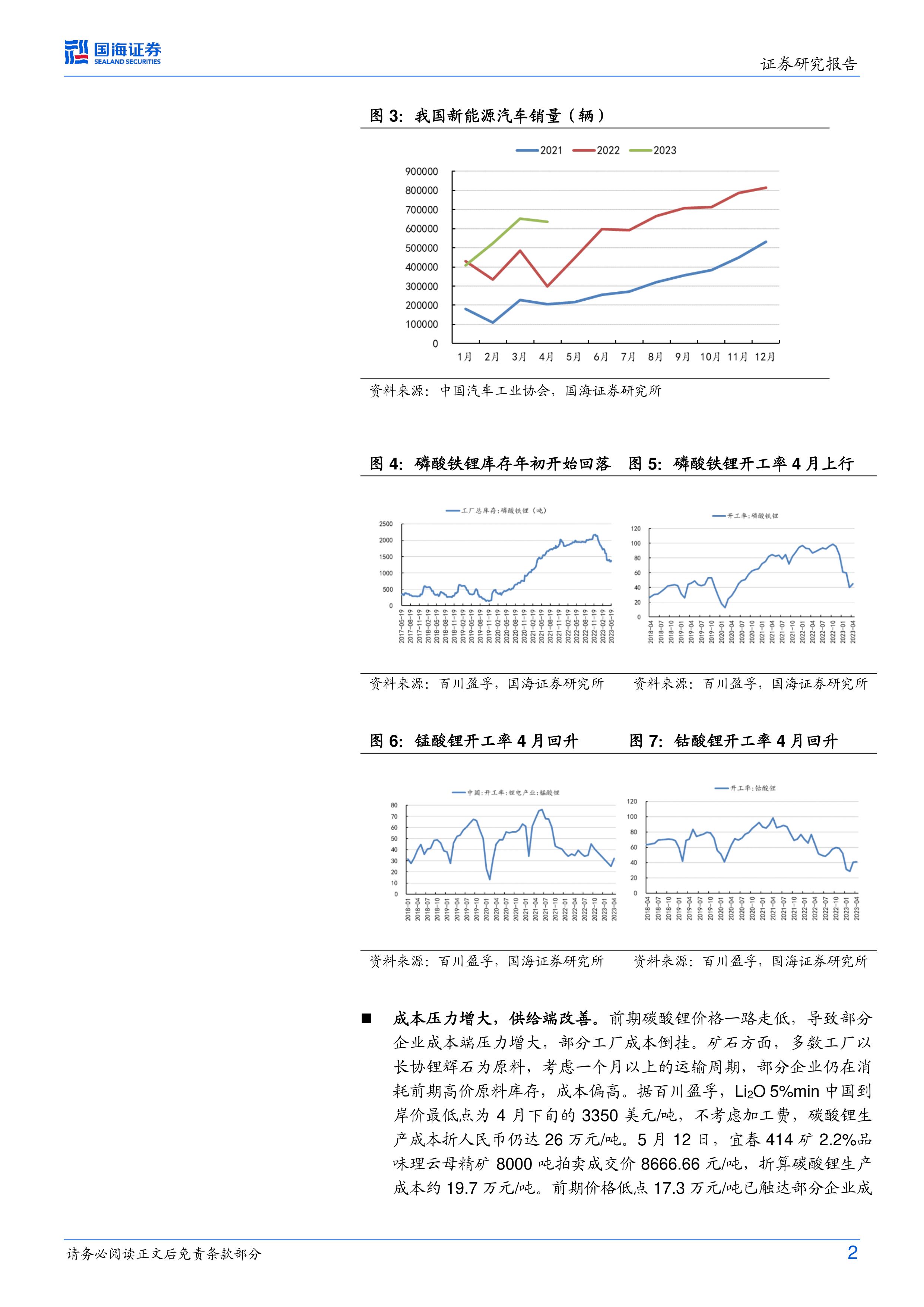 报告详细分析了碳酸锂市场供需两端的动态变化。供给方面,报告指出前期低价导致部分企业成本倒挂,部分工厂停产或减产,供应端有所好转;进口锂辉石价格回升也支撑了成本端。需求方面,报告强调新能源汽车销量增长是拉动碳酸锂需求的关键,4月份新能源汽车销量同比增长1.1倍,下游磷酸铁锂、锰酸锂、钴酸锂等开工率均有回升。库存方面,报告指出碳酸锂库存已由高位开始回落,这与下游需求好转密切相关。