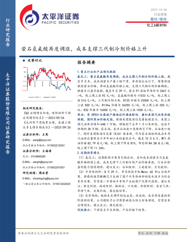 化工&新材料行业周报:萤石氢氟酸再度调涨,成本支撑三代制冷剂价格上升