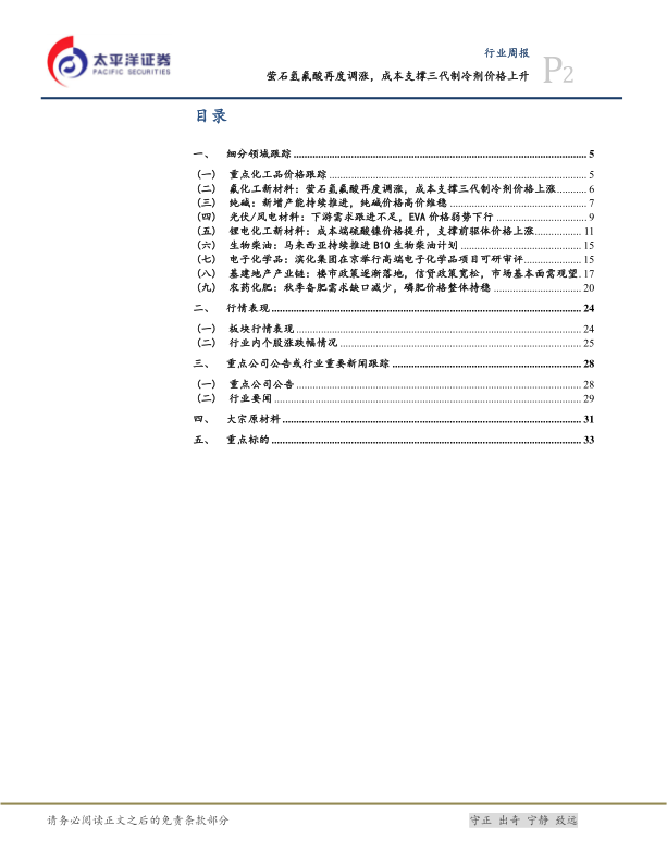 本部分对重点化工品价格、氟化工新材料、纯碱、光伏/风电材料、锂电化工新材料、生物柴油、电子化学品、基建地产产业链以及农药化肥等九个细分领域进行了跟踪分析,详细阐述了各领域的价格波动、供需变化、成本因素以及行业发展趋势。 数据主要来源于百川盈孚和Wind,并辅以图表直观展现市场动态。