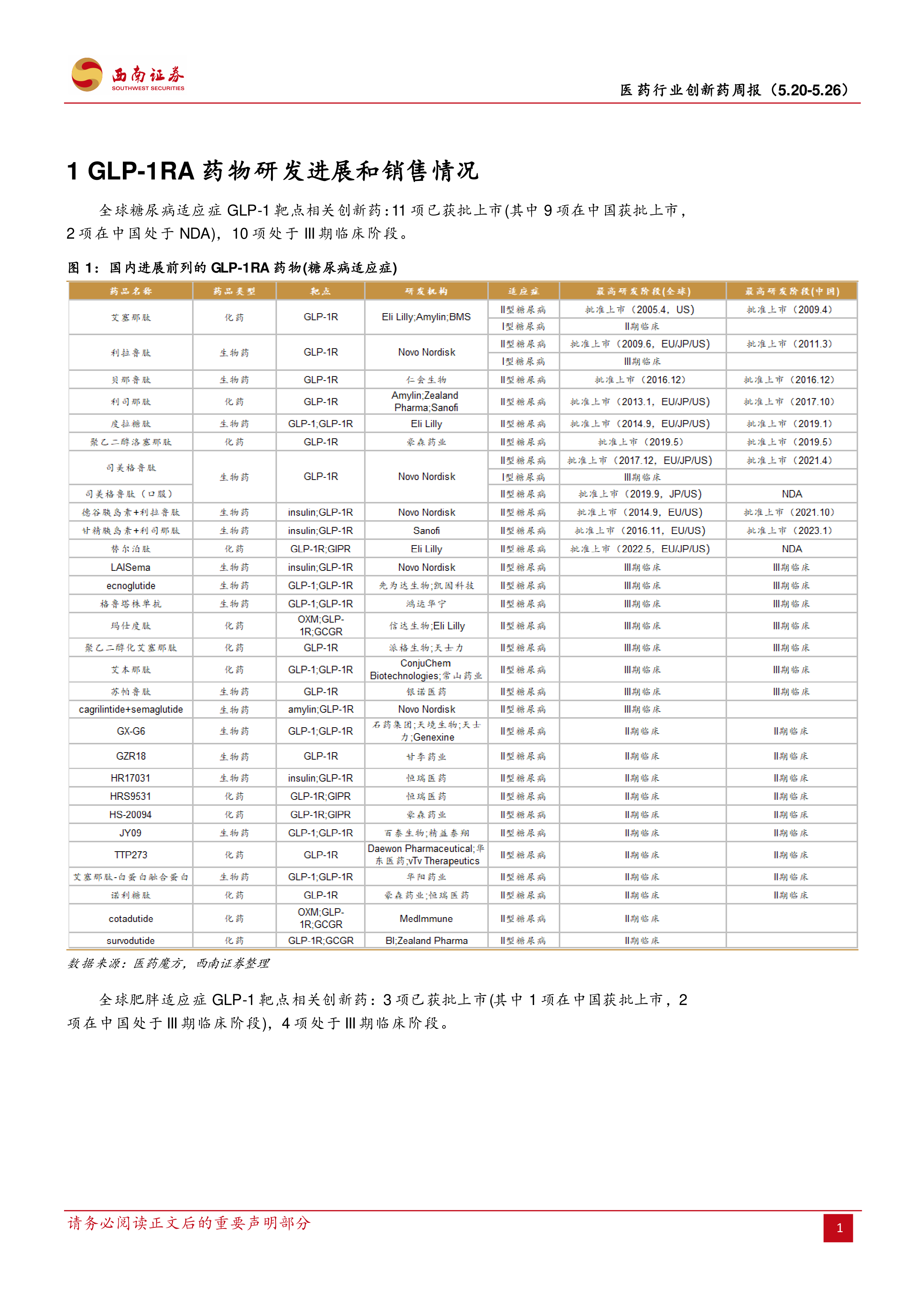 本报告的核心观点是:2024年5月第四周,A股和港股创新药板块整体表现疲软,跑输主要市场指数。国内创新药研发进展积极,5月获批上市新药数量可观,但港股创新药板块跌幅显著,部分个股跌幅超过15%。PD-1/VEGF双抗依沃西单抗获批上市是本周医药行业的重要事件,为EGFR突变非小细胞肺癌治疗带来新的选择。此外,报告还分析了GLP-1药物的市场表现和研发进展,以及本周全球创新药交易情况。