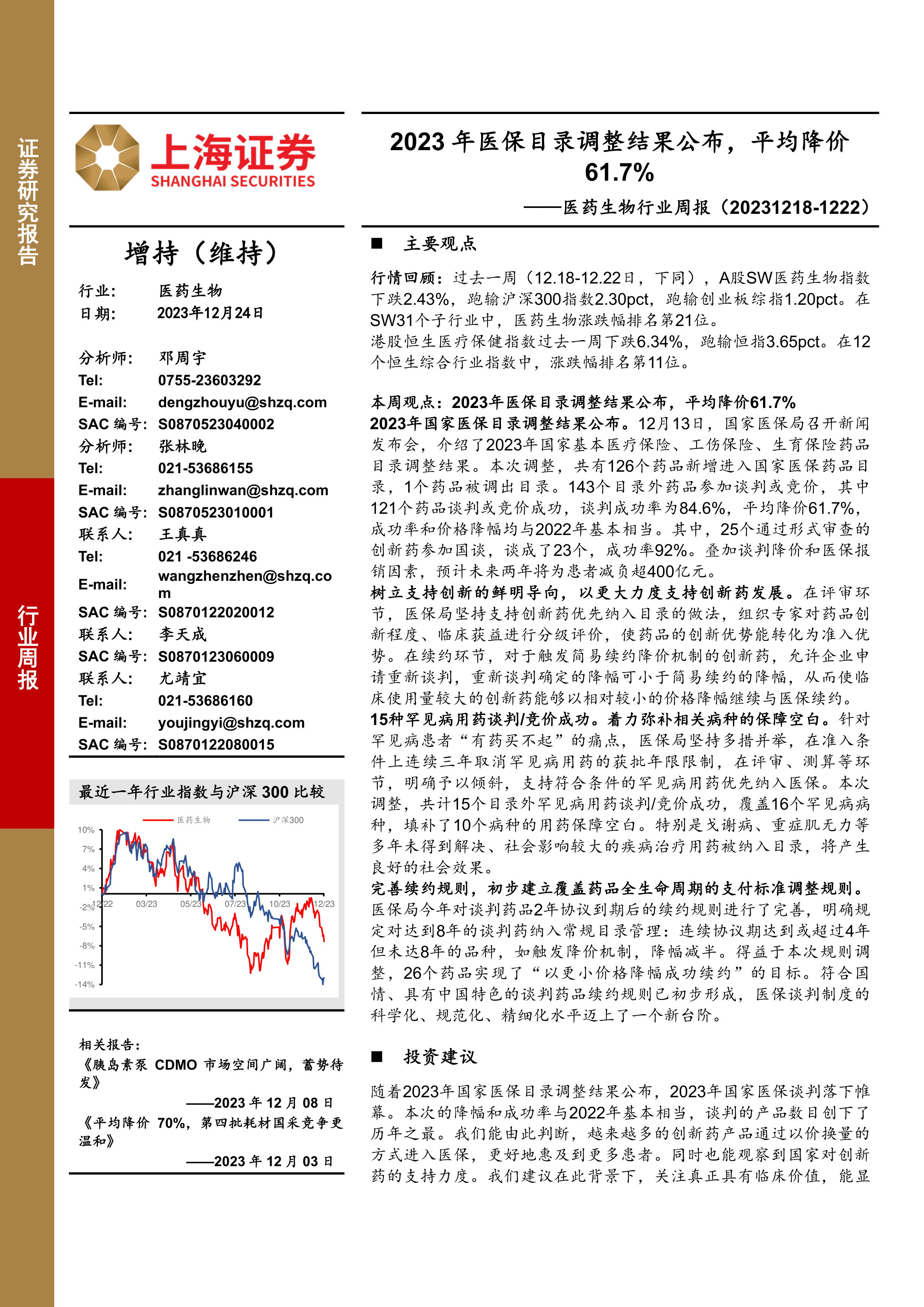 本周观点:2023年医保目录调整结果公布,平均降价61.7%
