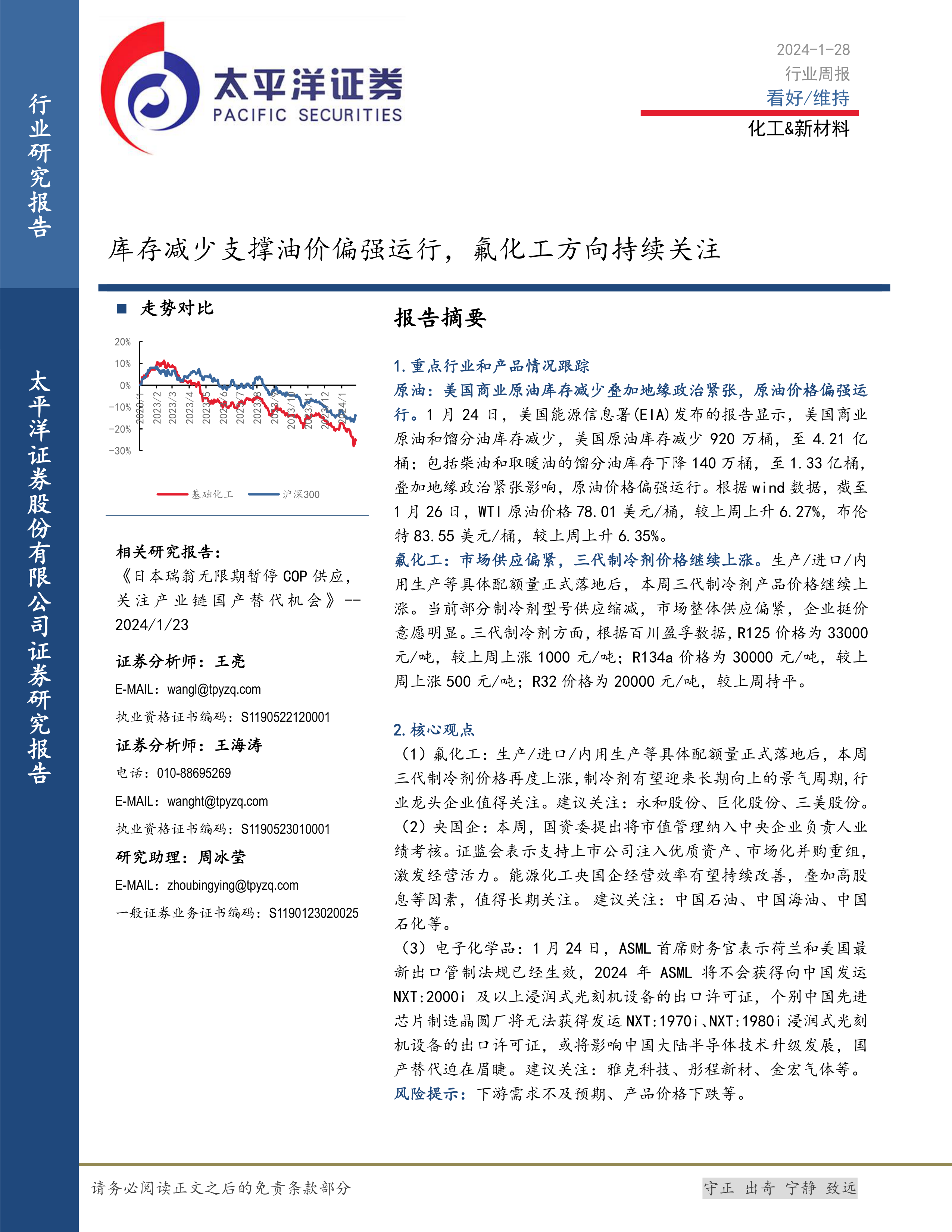 化工&新材料行业周报:库存减少支撑油价偏强运行,氟化工方向持续关注