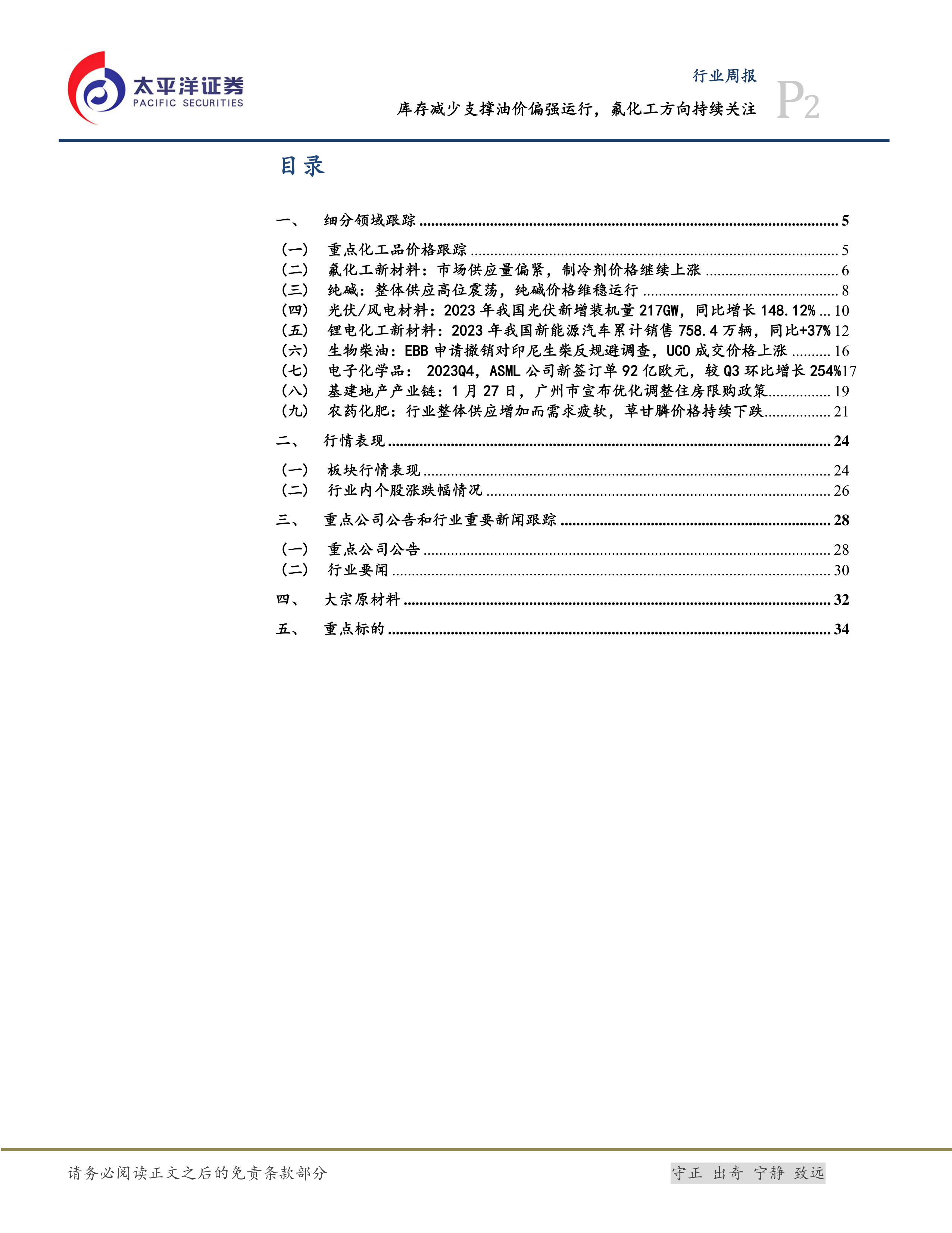 本报告基于公开数据,对2024年1月22日至26日期间中国化工行业进行了全面分析。报告指出,氟化工行业景气度提升,央国企经营效率有望改善,电子化学品国产替代加速,原油价格偏强运行。报告还详细分析了各细分领域的市场行情,重点公司的公告信息以及大宗原材料价格走势,并对部分公司进行了投资评级建议。 需要注意的是,报告中的信息和观点仅供参考,不构成投资建议,投资者需独立判断并承担投资风险。