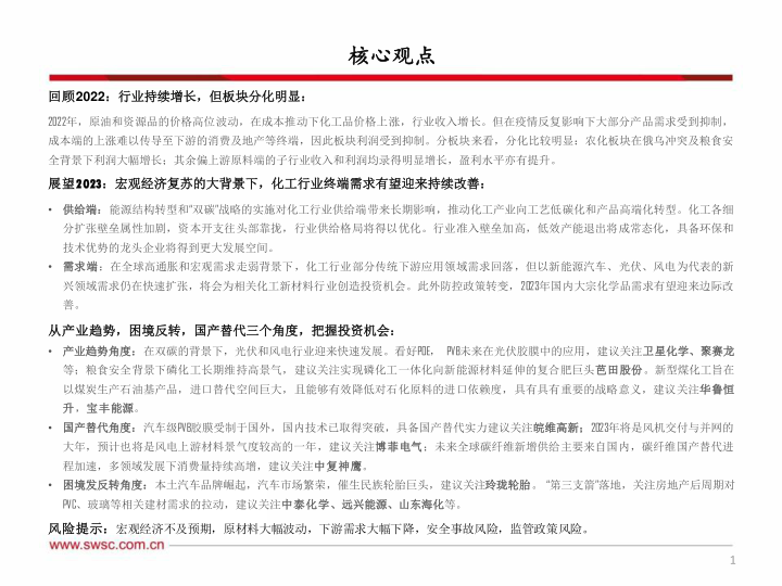 本报告的核心观点是:2022年化工行业整体保持增长,但板块分化显著;2023年在宏观经济复苏的大背景下,化工行业终端需求有望改善,行业供给格局将优化。投资机会主要来自三个方面:产业趋势(光伏、风电、磷化工、新型煤化工)、国产替代(汽车级PVB胶膜、风电上游材料、碳纤维)和困境反转(轮胎、房地产后周期相关建材)。报告建议关注部分具有竞争优势的龙头企业。