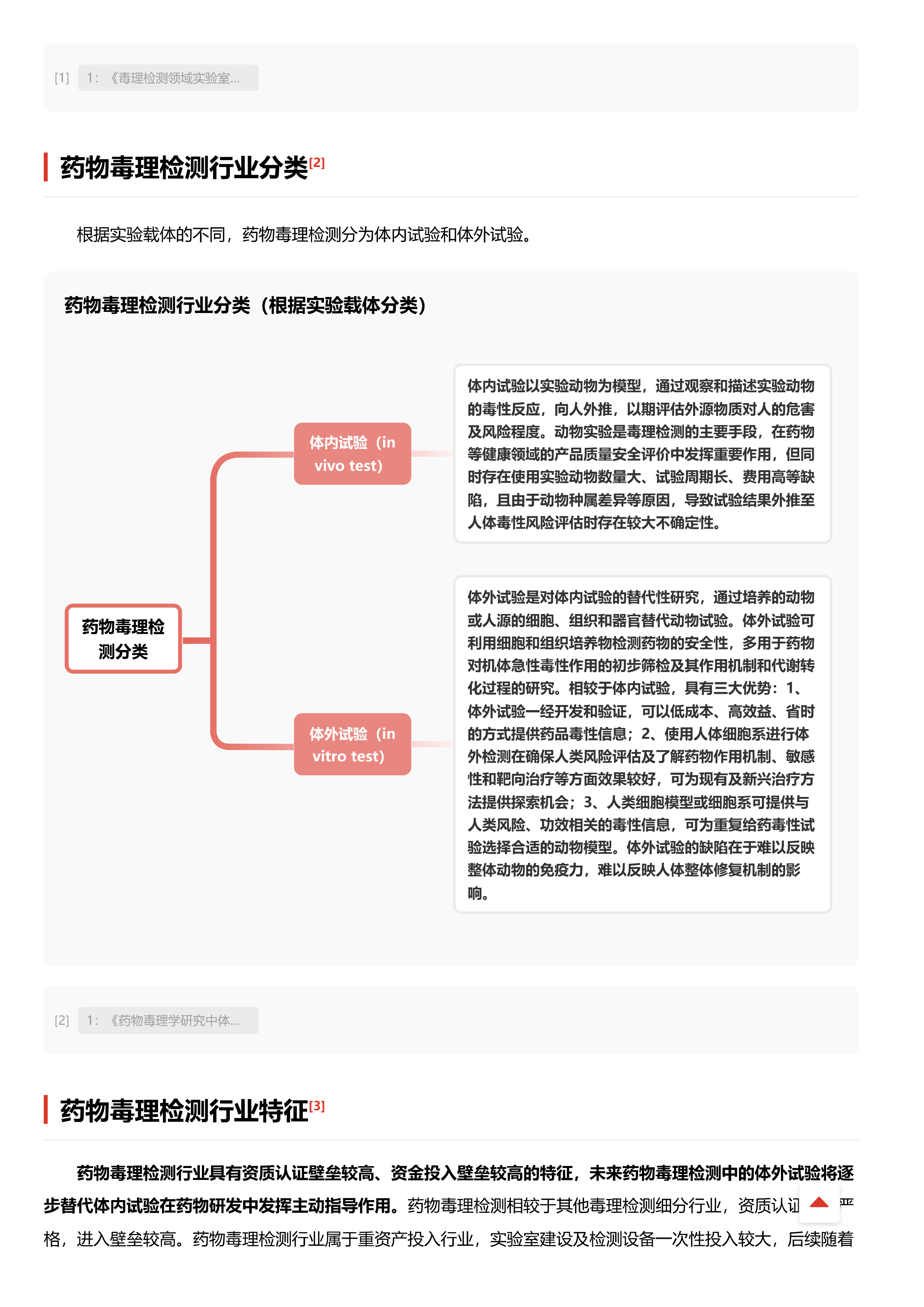 毒理检测又称法规毒理学,是对化学物质或者产品进行安全性评价的主要手段,药物毒理检测指检测对象为药物的毒理学检测项目。药物毒理检测行业具有资质认证壁垒较高、资金投入壁垒较高的特征,未来药物毒理检测中的体外试验将逐步替代体内试验在药物研发中发挥主动指导作用。按照机构营业收入口径,中国药物毒理检测行业市场规模由2018年的7.9亿元上升至2022年的14.1亿元,年均复合增长率为15.8%,预计到2027年,市场规模将增长至27.3亿元,年均复合增长率达14.1%。未来中国药品监督管理体系的不断完善将有效促进毒理检测市场规模增长,行业参与者的增多有望推动药物毒理检测行业市场规模扩大