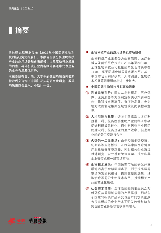 本节深入分析了推动中国医药生物科技产业发展的五个关键因素: