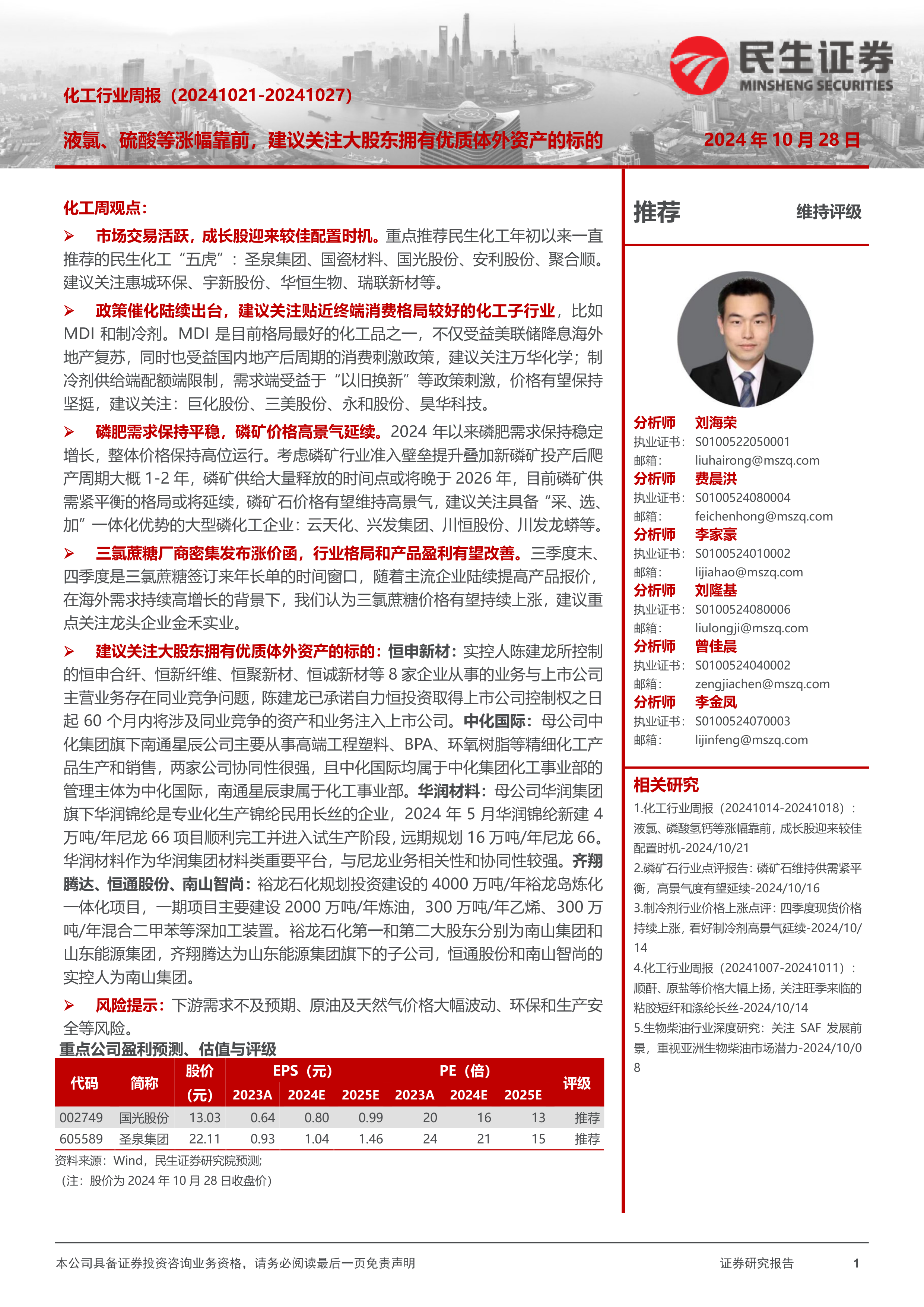 本报告的核心观点是:化工行业市场交易活跃,成长股迎来较佳配置时机。部分化工产品价格上涨,例如液氯、硫酸等,建议关注大股东拥有优质体外资产的标的,以及受益于政策催化的子行业,如MDI和制冷剂。同时,磷矿价格高景气度有望延续,三氯蔗糖行业格局和产品盈利有望改善。