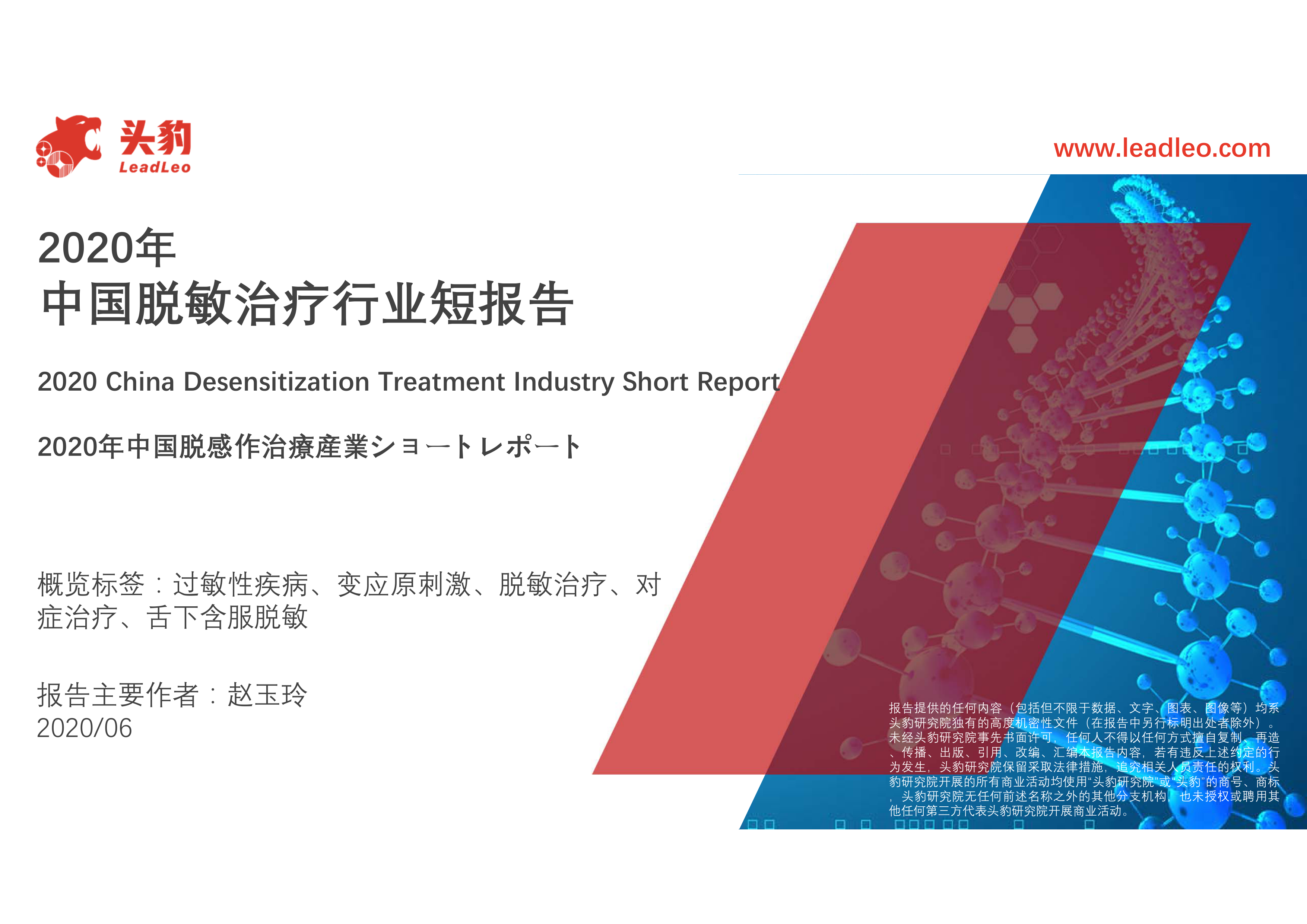 本报告基于头豹研究院2020年发布的《中国脱敏治疗行业短报告》,运用统计数据和市场分析,探讨中国脱敏治疗行业的发展现状、市场规模及未来趋势。报告核心观点如下: