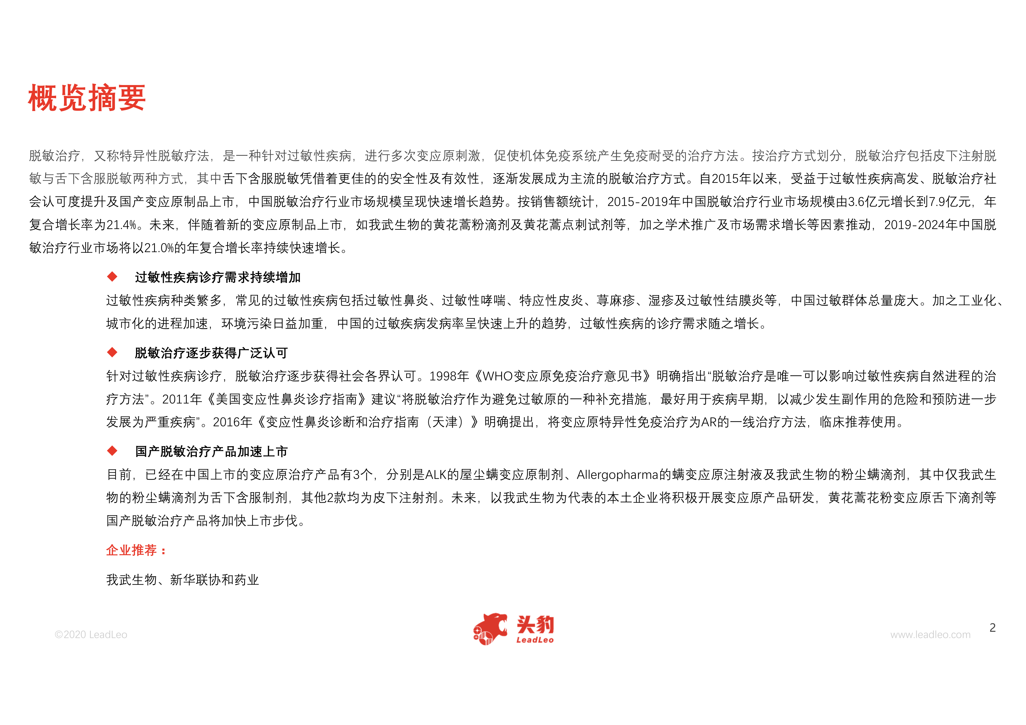 详细介绍了公司概况、产品研发进展、营销服务模式、优势和竞争力,并分析了其在脱敏治疗市场上的投资亮点。