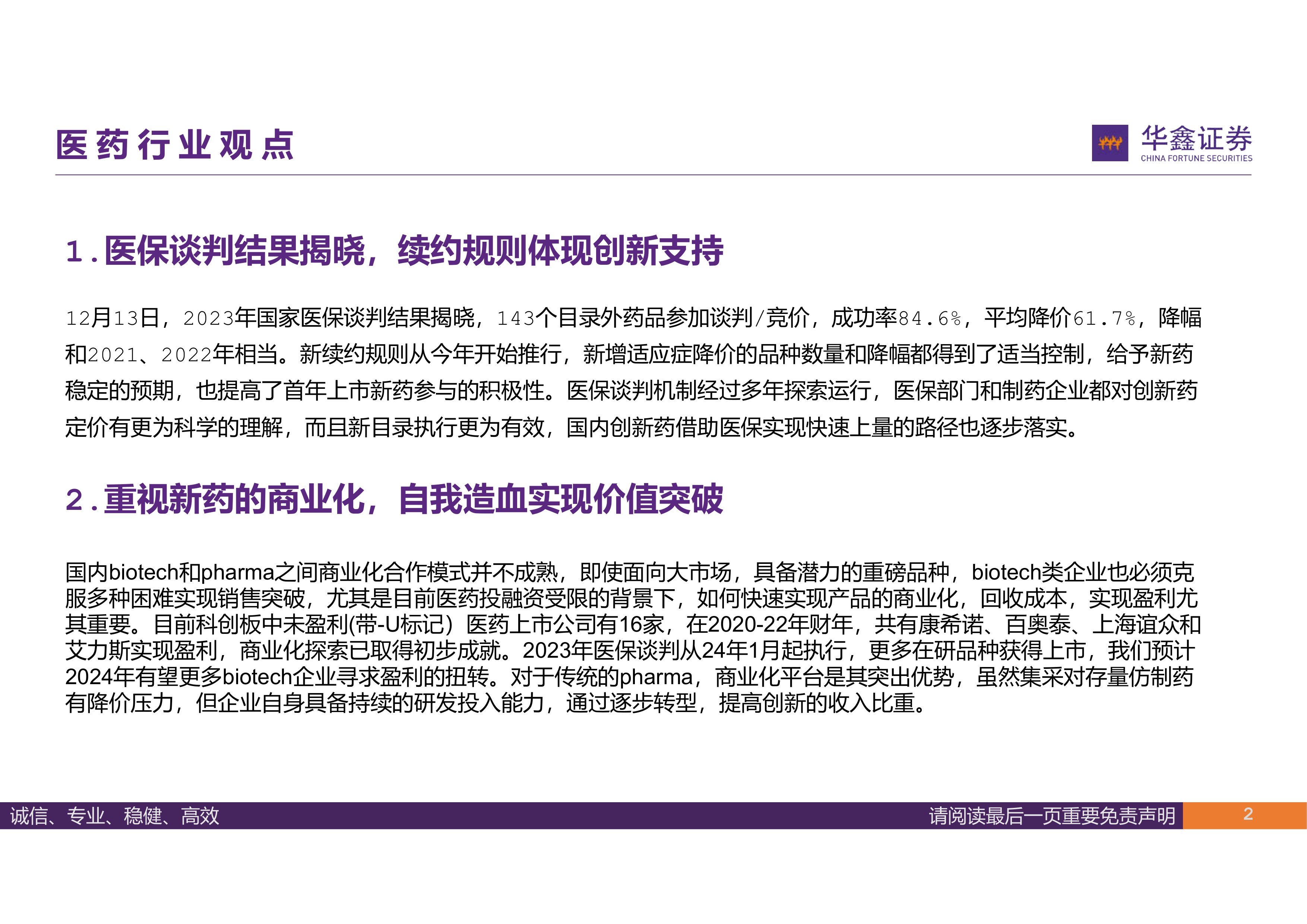 本报告的核心观点是:2024年中国医药行业值得期待,主要体现在创新药商业化突破、出海战略落地、以及呼吸道疾病高发带来的市场机遇等方面。医保谈判结果显示出对创新的支持,但同时也存在研发风险、销售不及预期、竞争加剧以及政策性风险等挑战。报告推荐关注创新药商业化、呼吸道疾病诊断治疗、医保谈判受益品种、出海企业以及零售药店等投资方向。