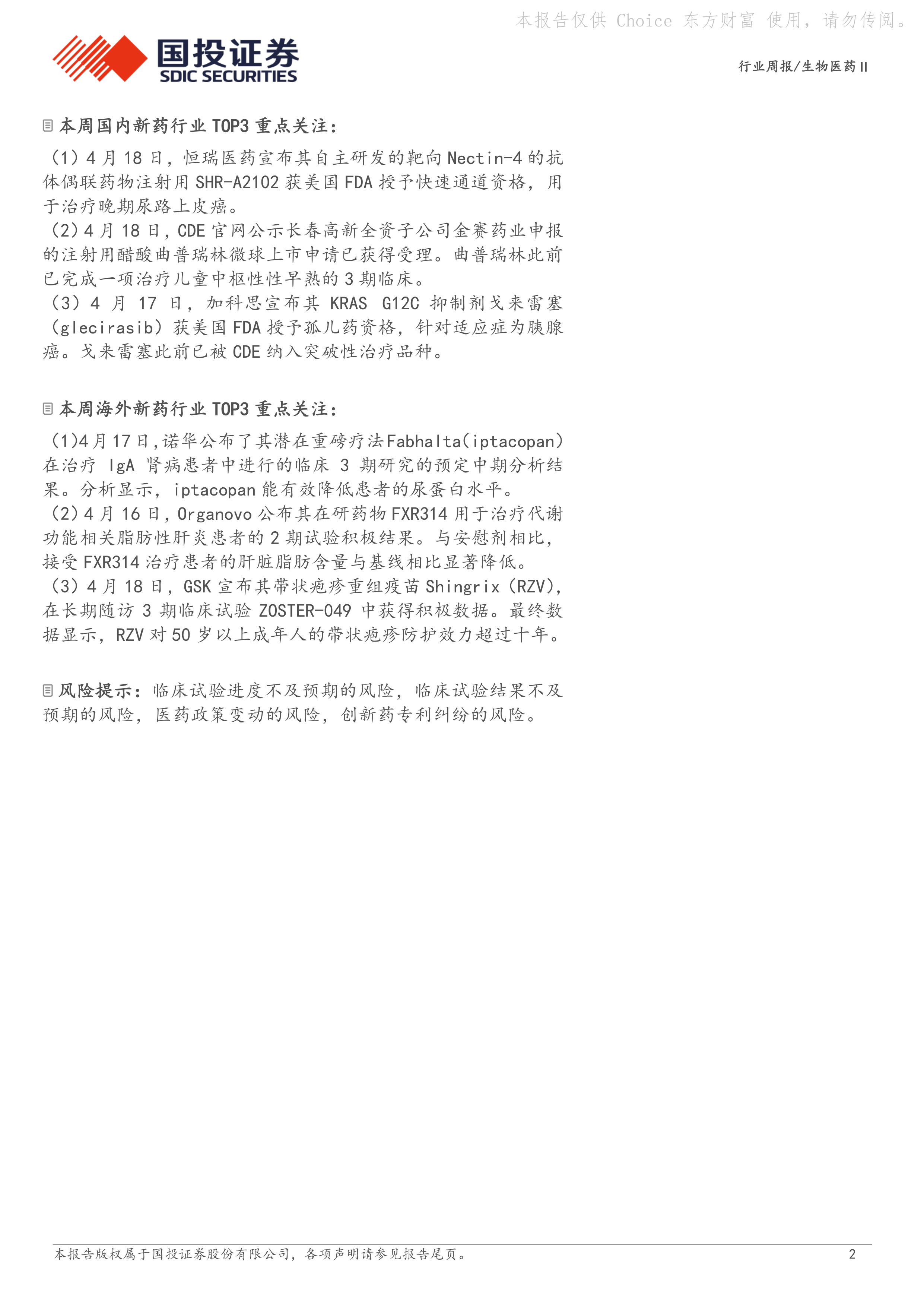 风险提示:临床试验进度不及预期的风险,临床试验结果不及预期的风险,医药政策变动的风险,创新药专利纠纷的风险。