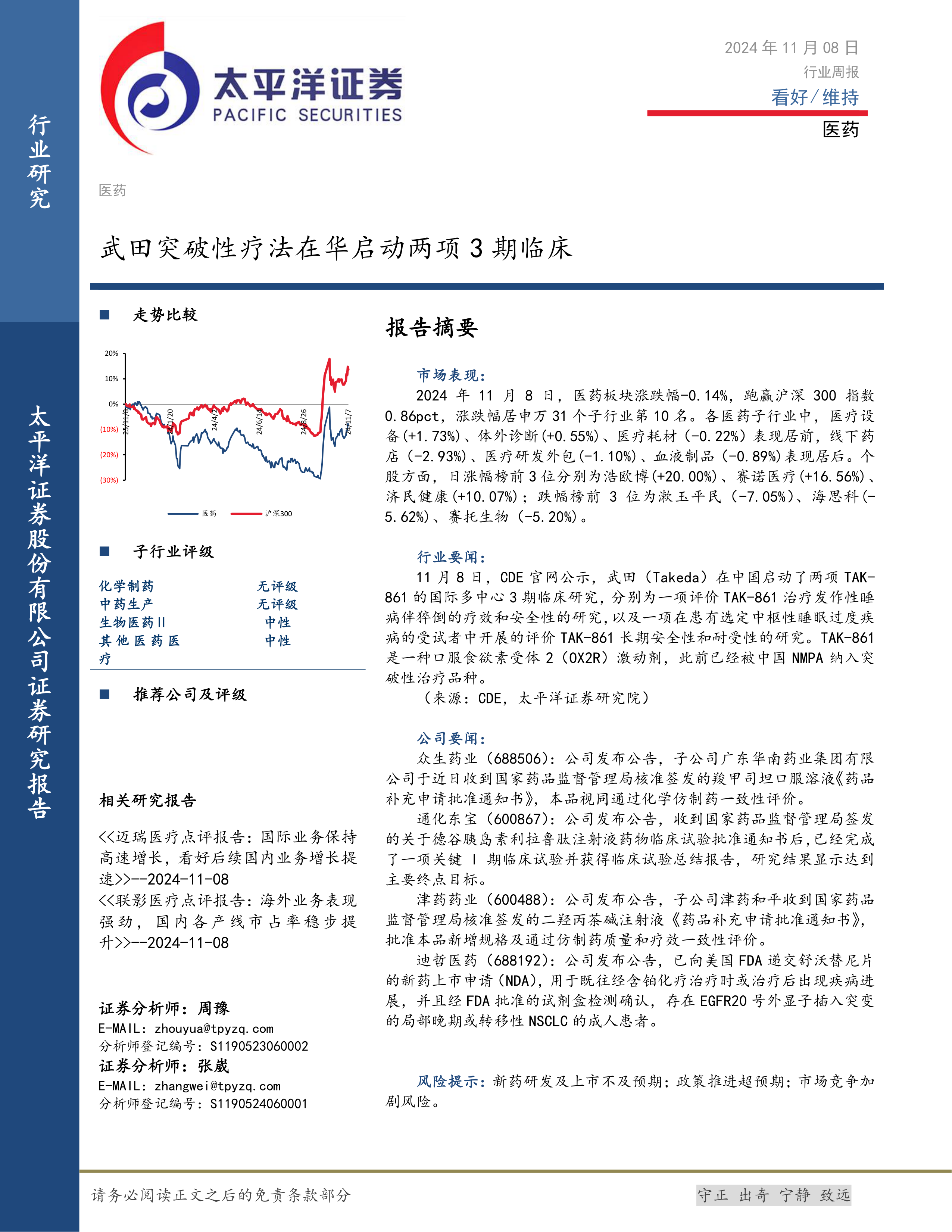 本报告对2024年11月8日医药行业周报进行了数据分析,指出医药板块整体表现平稳,但个股涨跌分化明显。武田制药突破性疗法在华启动三期临床试验是行业重要事件,但部分子行业表现不佳。 投资者需关注个股基本面和市场动态,谨慎投资,并注意报告中提到的风险因素。 未来医药行业发展仍存在不确定性,需要持续关注市场变化和政策调整。