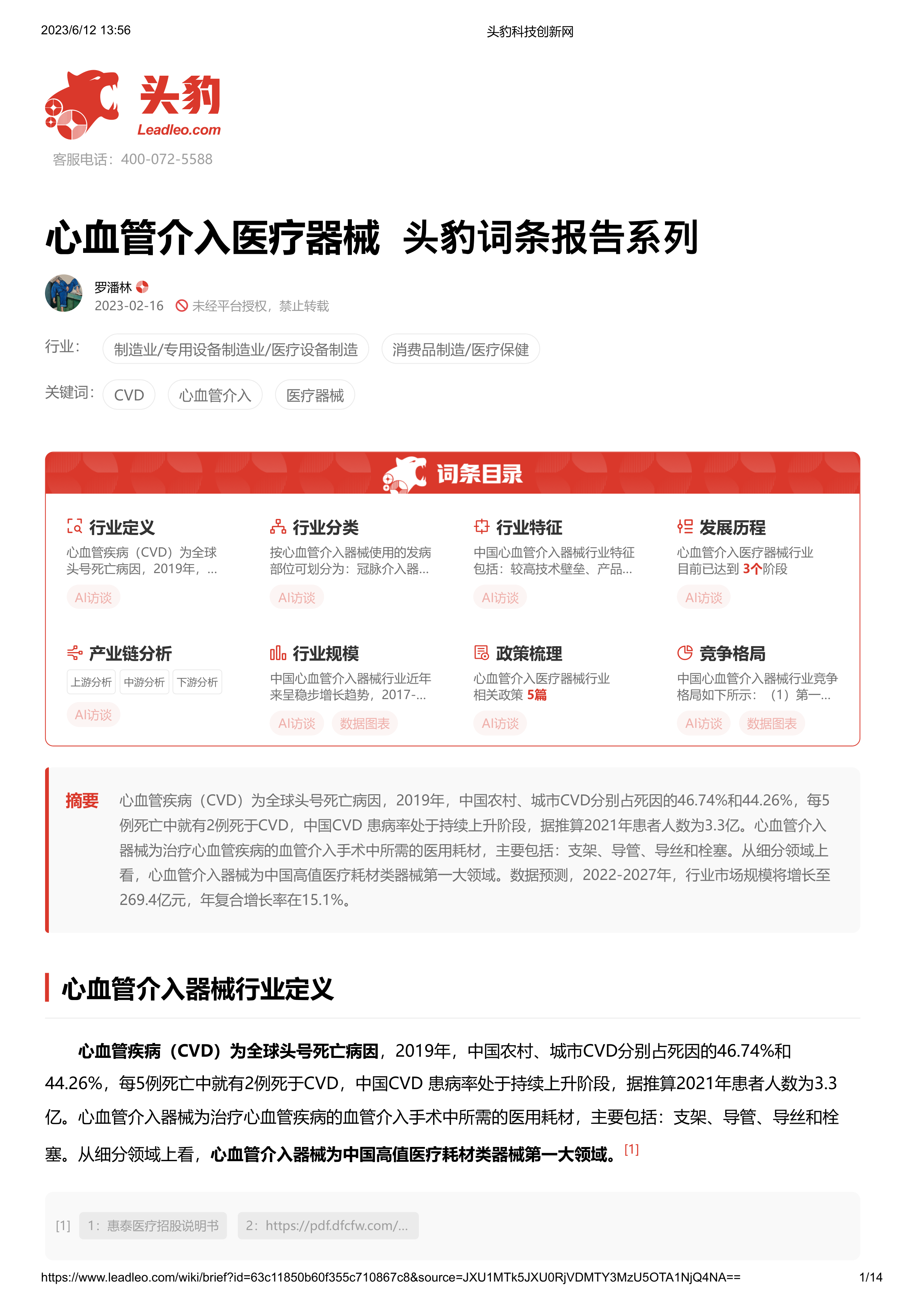 本报告基于头豹科技创新网发布的《心血管介入医疗器械》词条报告,运用统计数据和市场分析方法,对中国心血管介入医疗器械行业进行深入解读。报告核心观点如下: