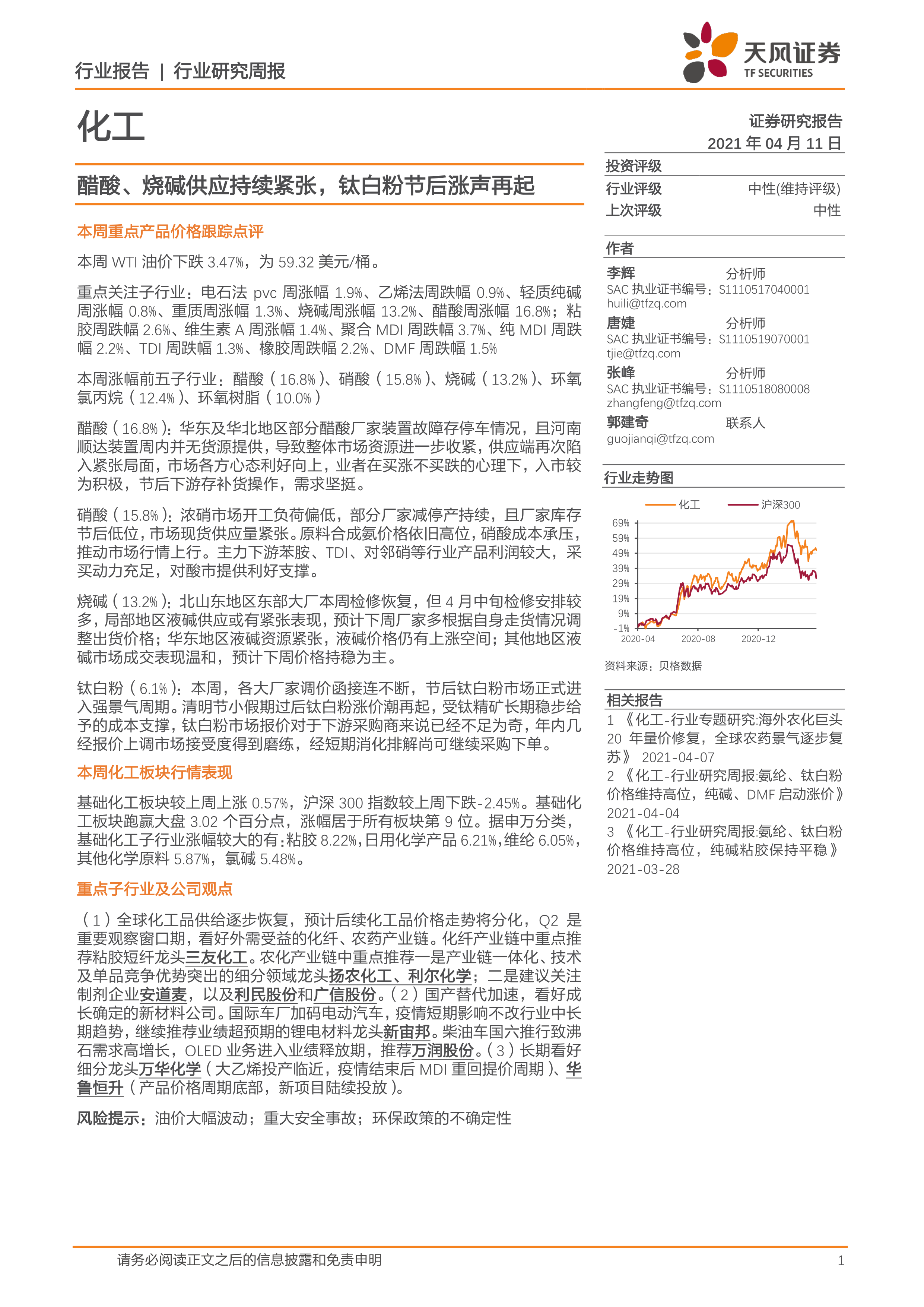 化工行业研究周报:醋酸、烧碱供应持续紧张,钛白粉节后涨声再起