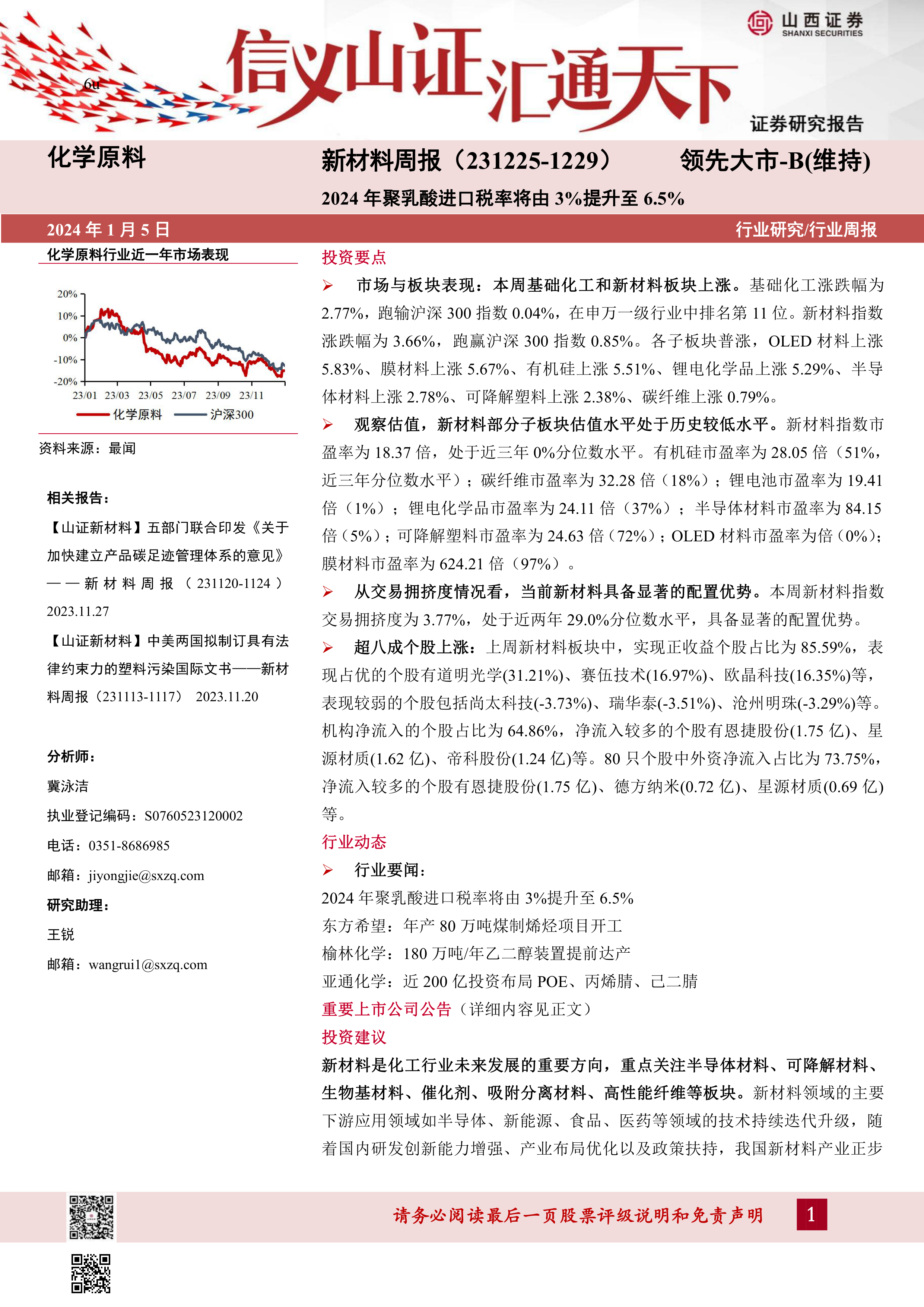 本周行业要闻主要包括:2024年聚乳酸进口税率将由3%提升至6.5%,这将有利于国内聚乳酸产业的发展;东方希望年产80万吨煤制烯烃项目开工,榆林化学180万吨/年乙二醇装置提前达产,亚通化学近200亿投资布局POE、丙烯腈、己二腈等项目,这些都体现了新材料行业持续投资和产能扩张的趋势。 上市公司公告方面,多家公司发布了关于投资、增资扩股、回购股票等公告,反映了公司积极的经营策略和发展规划。
