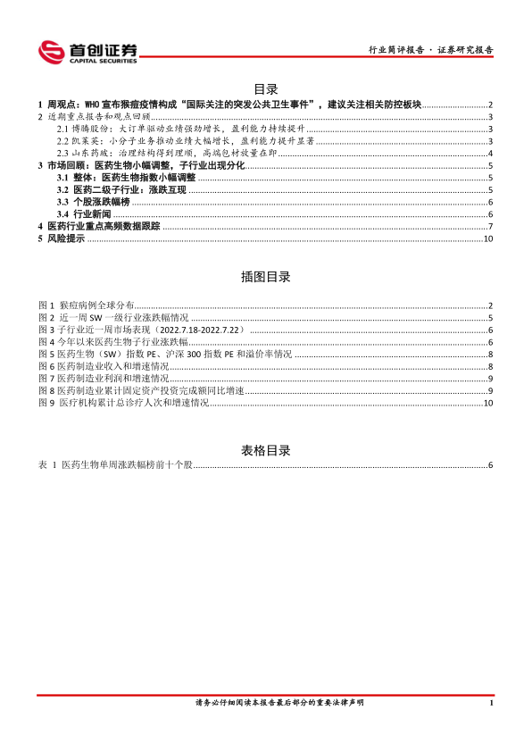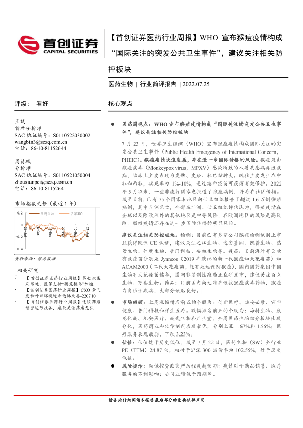 本报告的核心观点是:世界卫生组织(WHO)宣布猴痘疫情构成“国际关注的突发公共卫生事件”(PHEIC),这为相关防控板块带来了投资机会。报告建议关注猴痘检测、疫苗和药物相关领域的上市公司。同时,报告也分析了医药行业整体市场表现、估值水平以及部分重点公司的业绩情况。