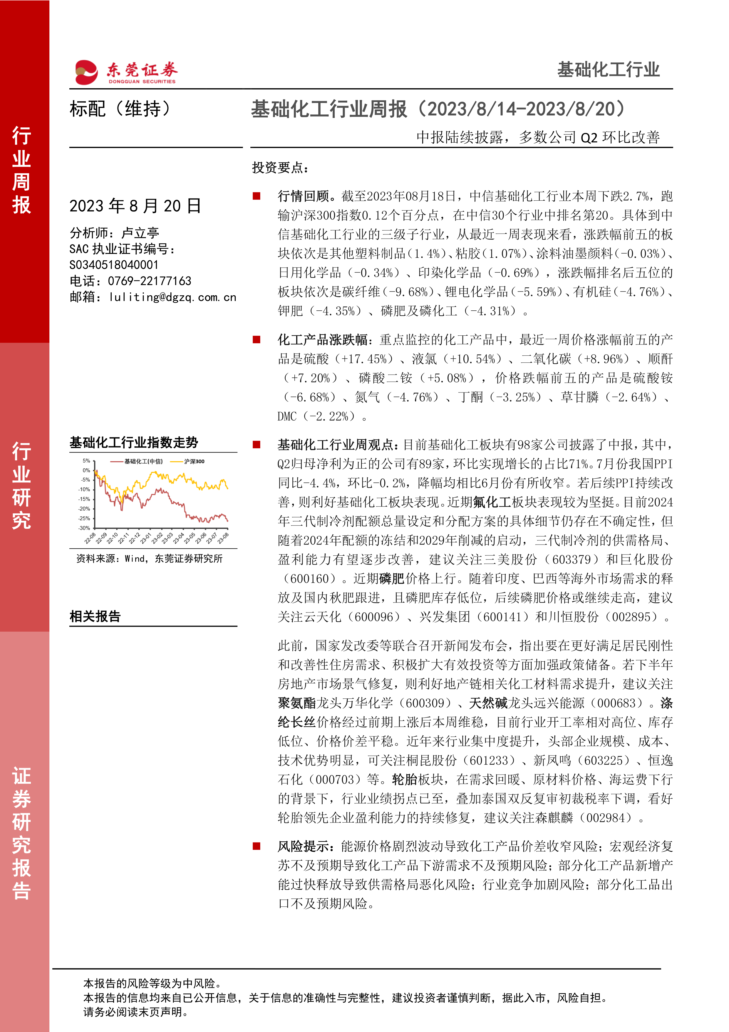 基础化工行业周报:中报陆续披露,多数公司Q2环比改善