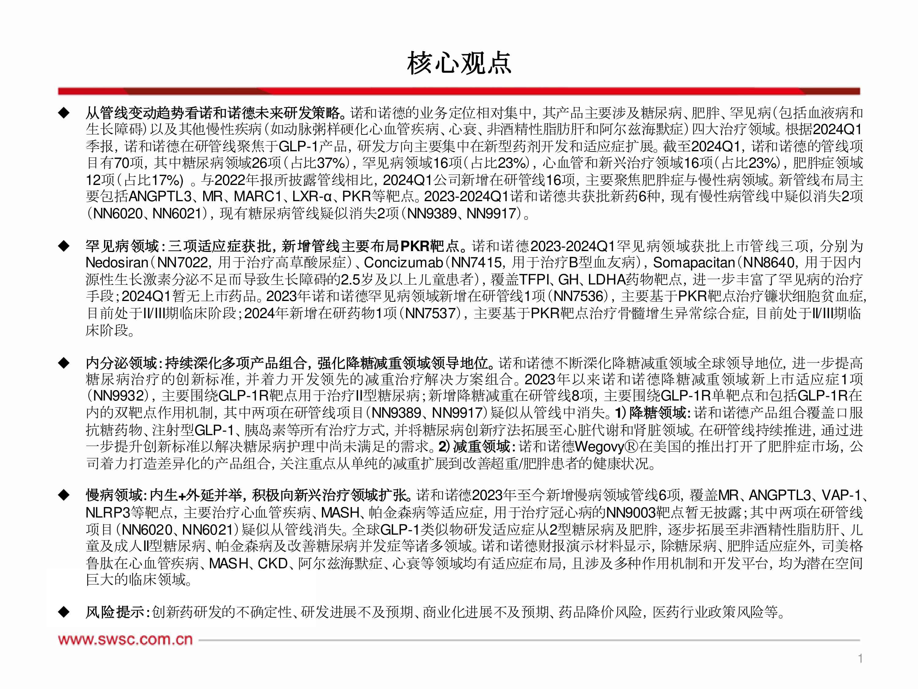 本报告的核心观点是:诺和诺德(Novo Nordisk)作为海外创新药龙头企业,其研发策略呈现出业务集中、GLP-1产品聚焦、适应症扩展以及内生外延并举的特征。通过对2022年报和2024年第一季度报数据的分析,可以看出诺和诺德在强化其在降糖减重领域的全球领先地位的同时,积极布局新兴治疗领域,例如罕见病和慢性病,以实现持续增长。其研发策略体现了大型制药公司在面对市场变化和技术进步时的战略调整方向。