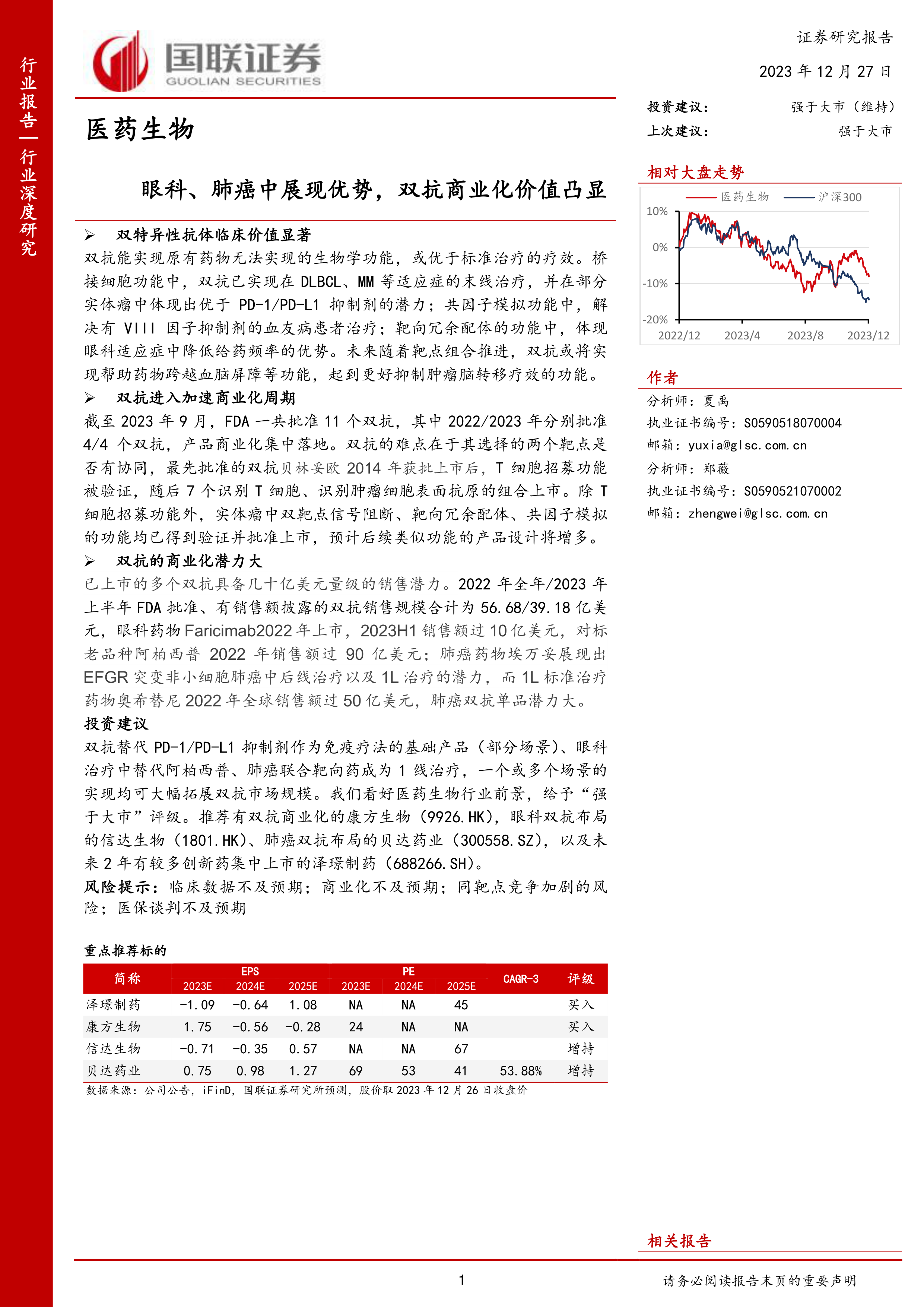 医药生物行业深度研究:眼科、肺癌中展现优势,双抗商业化价值凸显