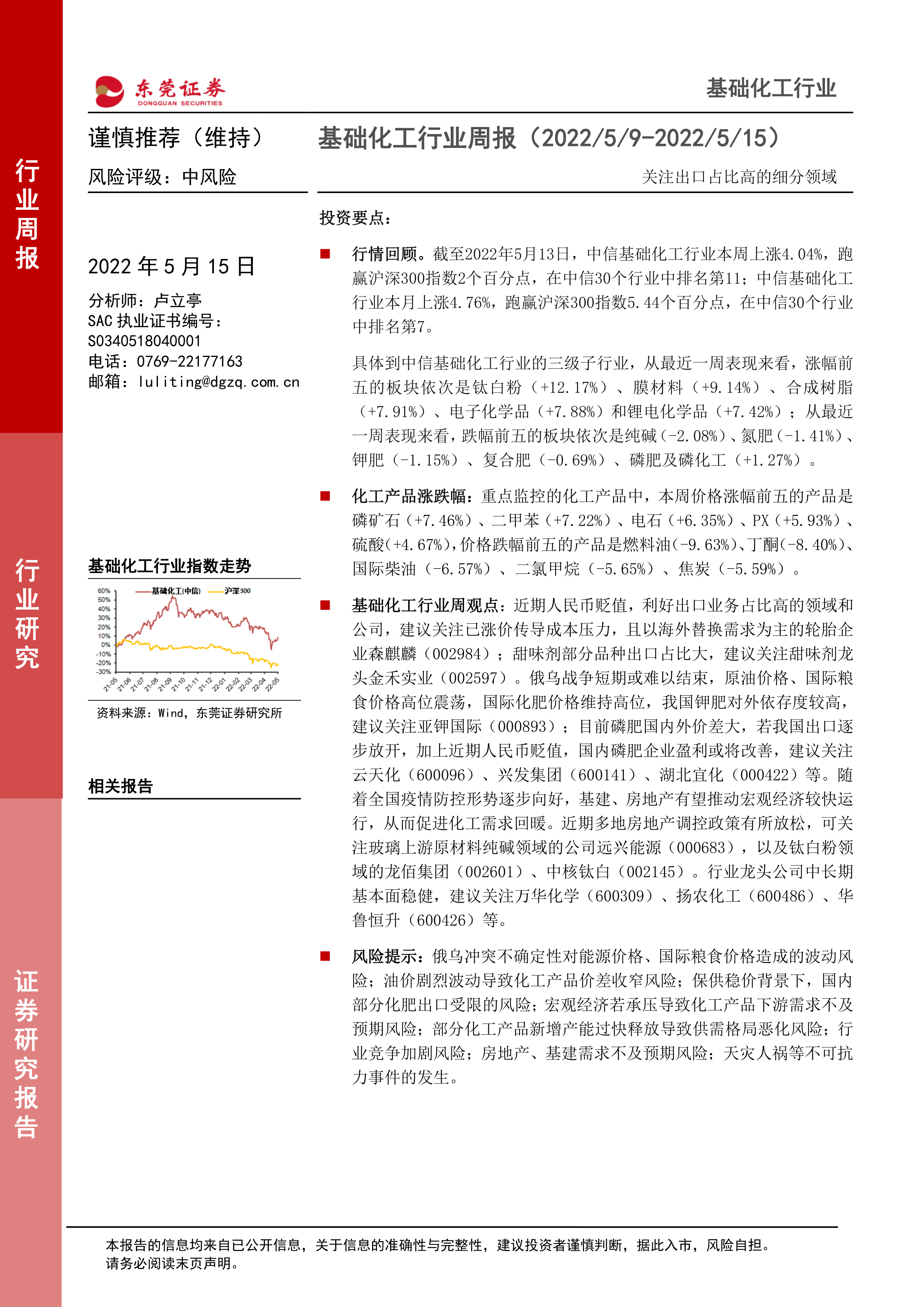 本报告对2022年5月9日至15日基础化工行业进行了周度回顾和分析。 行业整体表现强劲,但不同细分领域表现分化,部分产品价格波动剧烈。 人民币贬值利好出口导向型企业,但俄乌冲突和宏观经济形势仍是主要的不确定性因素。 报告建议投资者关注特定细分领域和龙头企业,并密切关注相关风险,谨慎投资。 报告中提供的投资建议仅供参考,投资者应根据自身情况进行独立判断,并承担相应的投资风险。