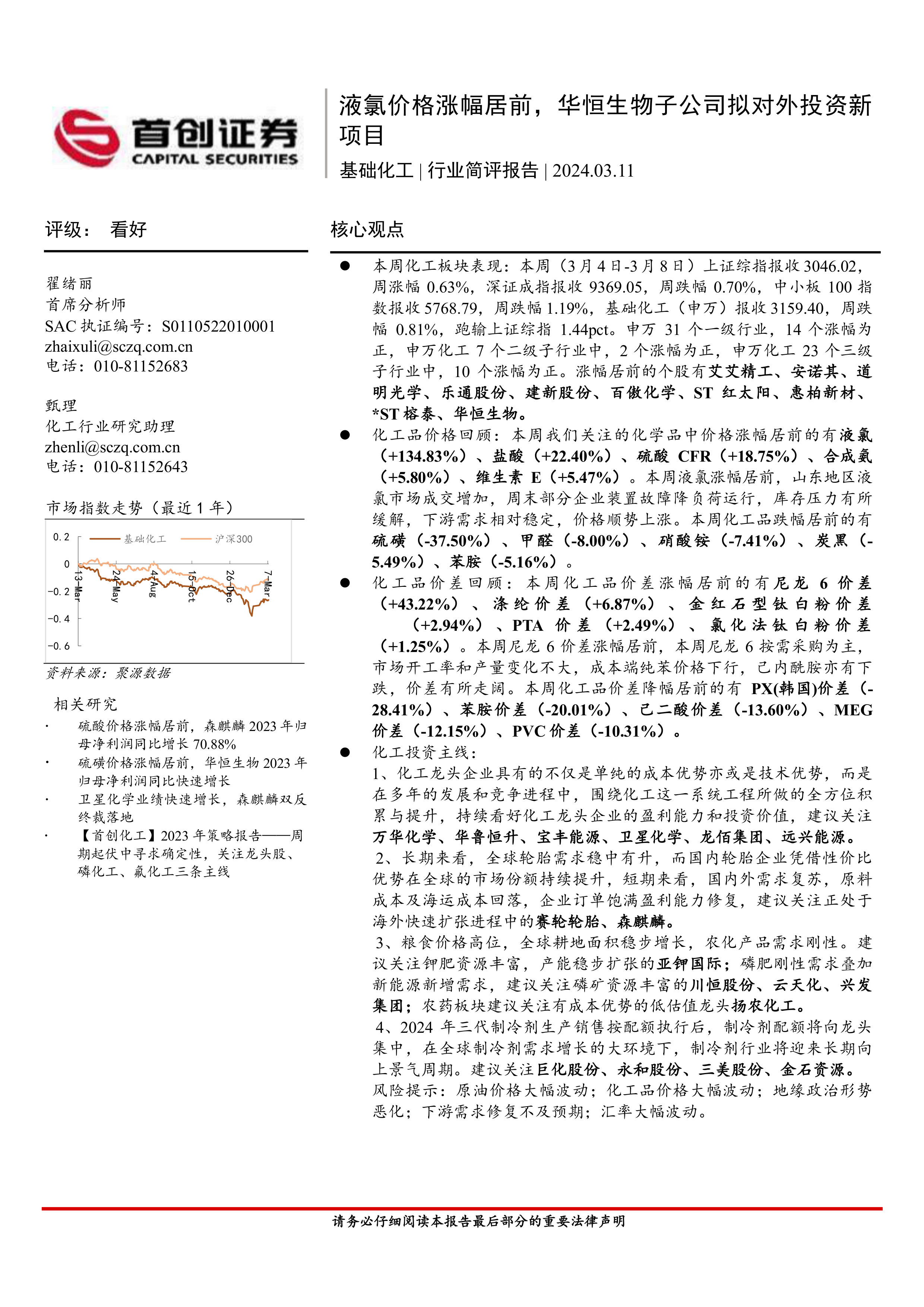 本报告的核心观点是:本周(3月4日-3月8日)基础化工板块表现弱于上证综指,但部分化工品价格涨幅显著,部分个股表现突出。液氯价格涨幅居前,达到134.83%,主要由于山东地区市场成交增加及部分企业装置故障导致库存压力缓解。华恒生物子公司拟投资建设新的氨基酸项目,显示出行业积极的投资动向。报告同时分析了化工品价格、价差走势,并对化工龙头企业、轮胎企业、农化企业和制冷剂企业进行了投资建议。