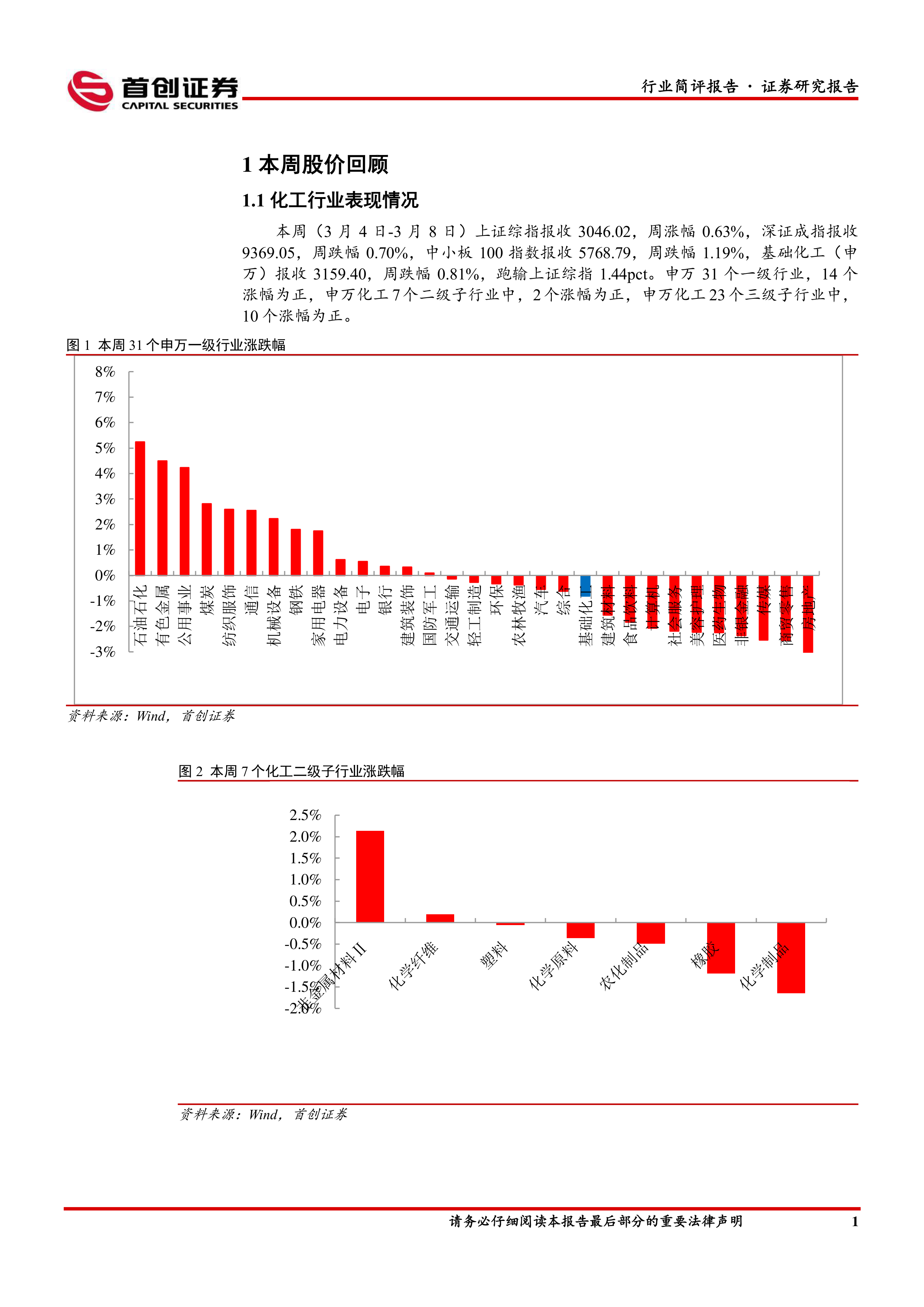 本周化工板块表现:本周(3月4日-3月8日)上证综指报收3046.02,周涨幅0.63%,深证成指报收9369.05,周跌幅0.70%,中小板100指数报收5768.79,周跌幅1.19%,基础化工(申万)报收3159.40,周跌幅0.81%,跑输上证综指1.44pct。申万31个一级行业,14个涨幅为正,申万化工7个二级子行业中,2个涨幅为正,申万化工23个三级子行业中,10个涨幅为正。涨幅居前的个股有艾艾精工、安诺其、道明光学、乐通股份、建新股份、百傲化学、ST红太阳、惠柏新材、*ST榕泰、华恒生物。