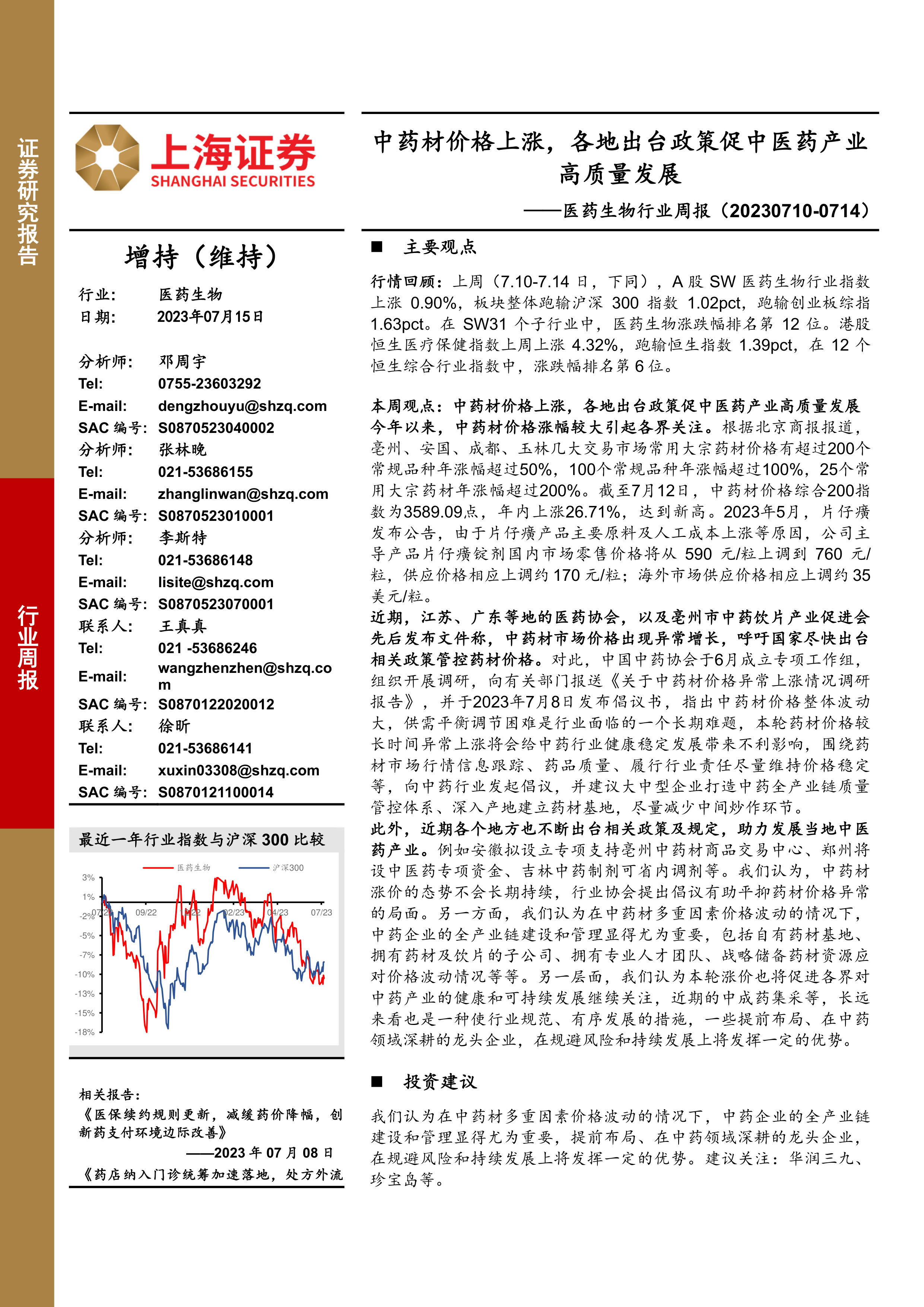 本周观点:中药材价格上涨,各地出台政策促中医药产业高质量发展今年以来,中药材价格涨幅较大引起各界关注。根据北京商报报道,亳州、安国、成都、玉林几大交易市场常用大宗药材价格有超过200个常规品种年涨幅超过50%,100个常规品种年涨幅超过100%,25个常用大宗药材年涨幅超过200%。截至7月12日,中药材价格综合200指数为3589.09点,年内上涨26.71%,达到新高。2023年5月,片仔癀发布公告,由于片仔癀产品主要原料及人工成本上涨等原因,公司主导产品片仔癀锭剂国内市场零售价格将从 590 元/粒上调到 760 元/粒,供应价格相应上调约 170 元/粒;海外市场供应价格相应上调约 35美元/粒。
